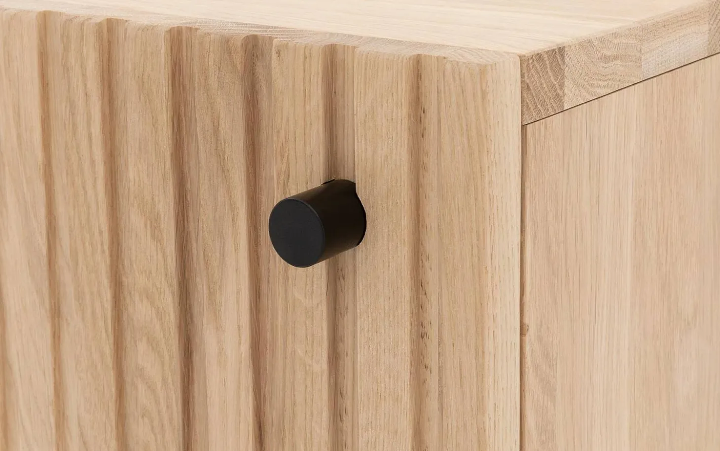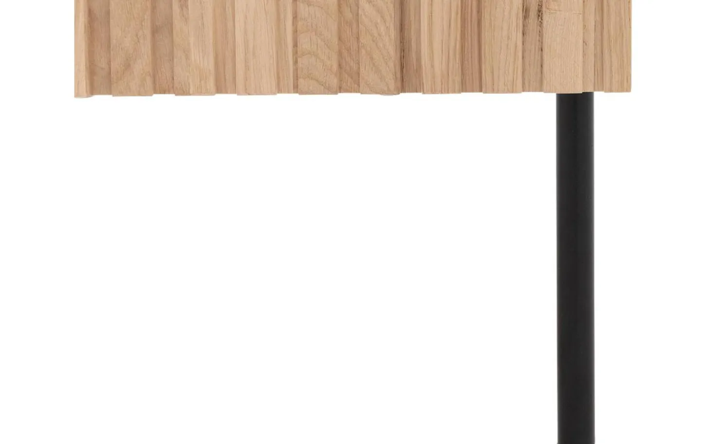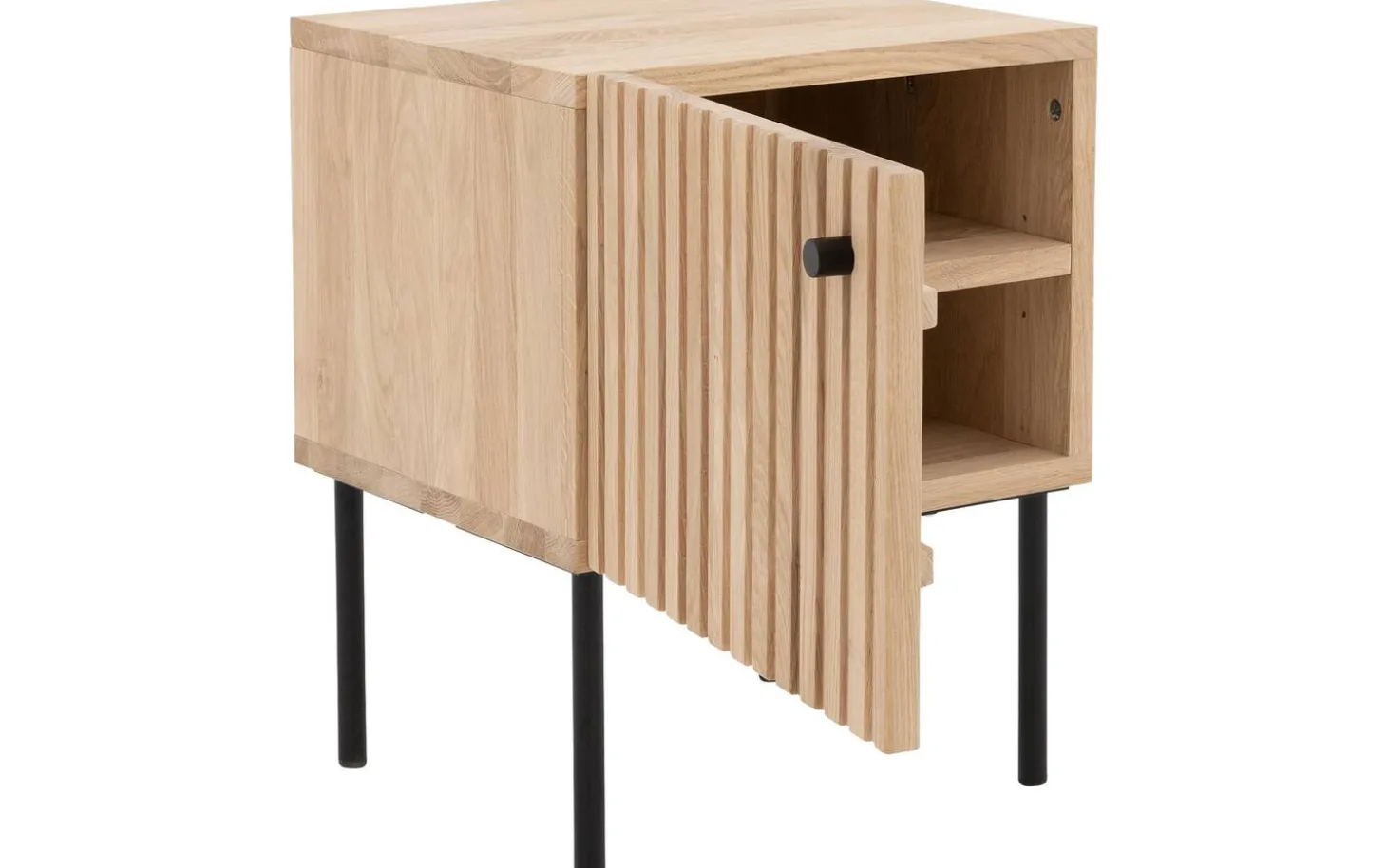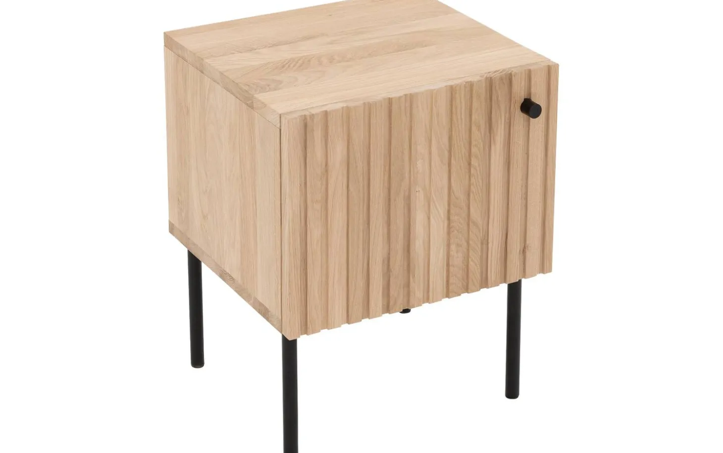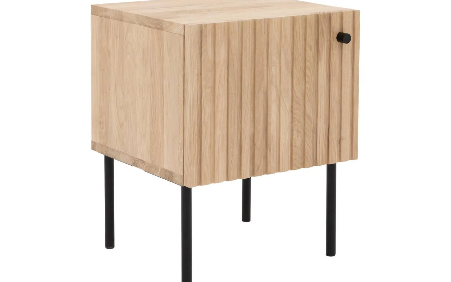 Das Nachtschränkchen Capelli besticht durch sein modernes Design. Ein besonderes Merkmal dieses Möbelstücks sind die vertikalen Linien im Eichenholz, die in Kombination mit den schwarzen runden Metallfüßen und einem passenden Griff für eine moderne Optik sorgen. Die hohen Füße sorgen für eine räumliche Note und erleichtern zudem das Staubsaugen unter dem Nachtschränkchen.
