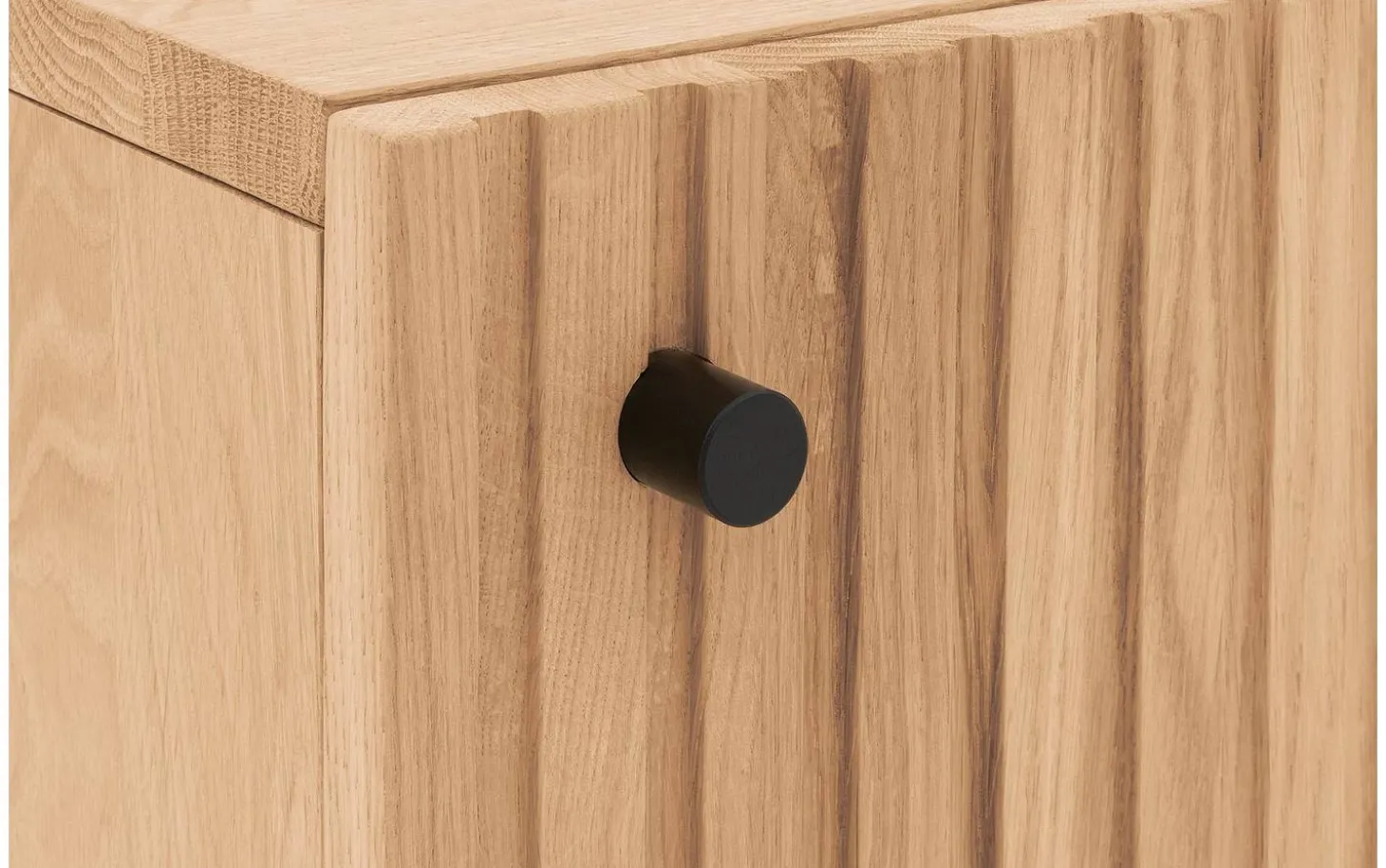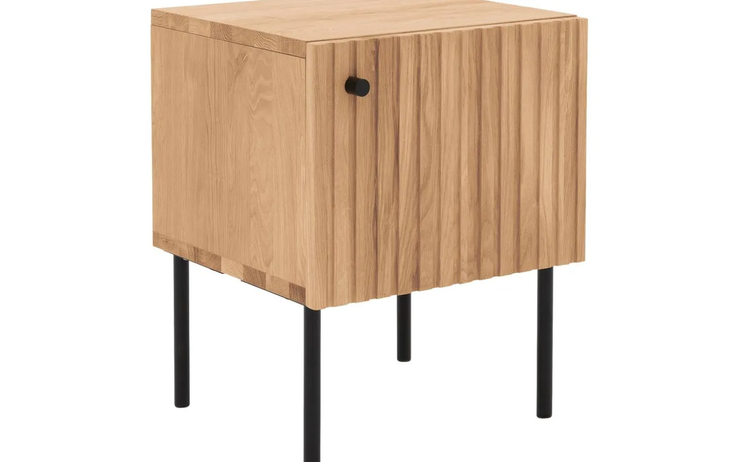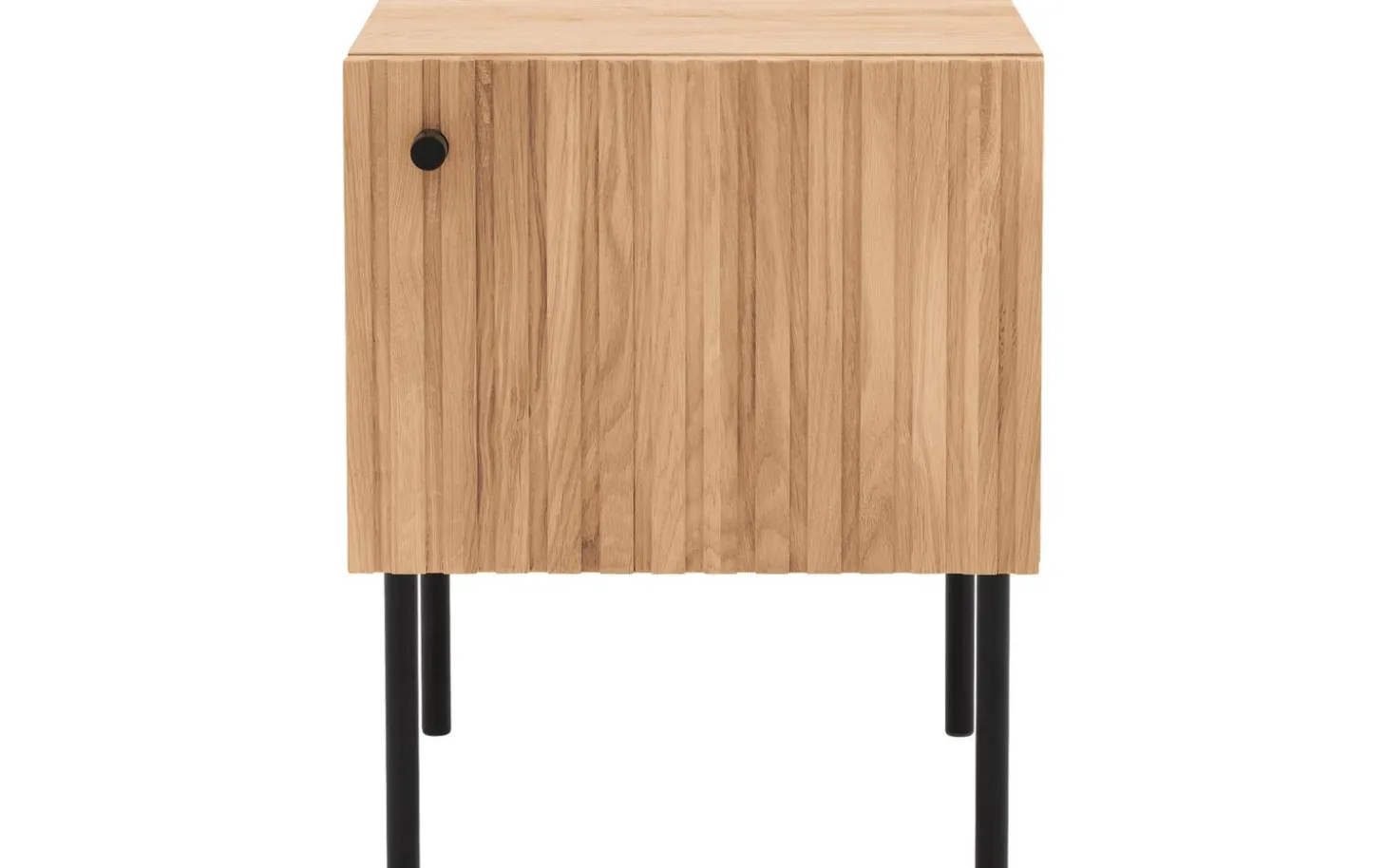 Nachtkastje Capelli heeft een modern design. Bijzonder aan het ontwerp zijn de verticale lijnen in het eikenhout. Dit geeft het nachtkastje in combinatie met de zwarte metalen ronde poten en het bijpassende handgreepje een moderne uitstraling. De hoge poten geven een ruimtelijke look en maken het schoonmaken onder het nachtkastje gemakkelijk.