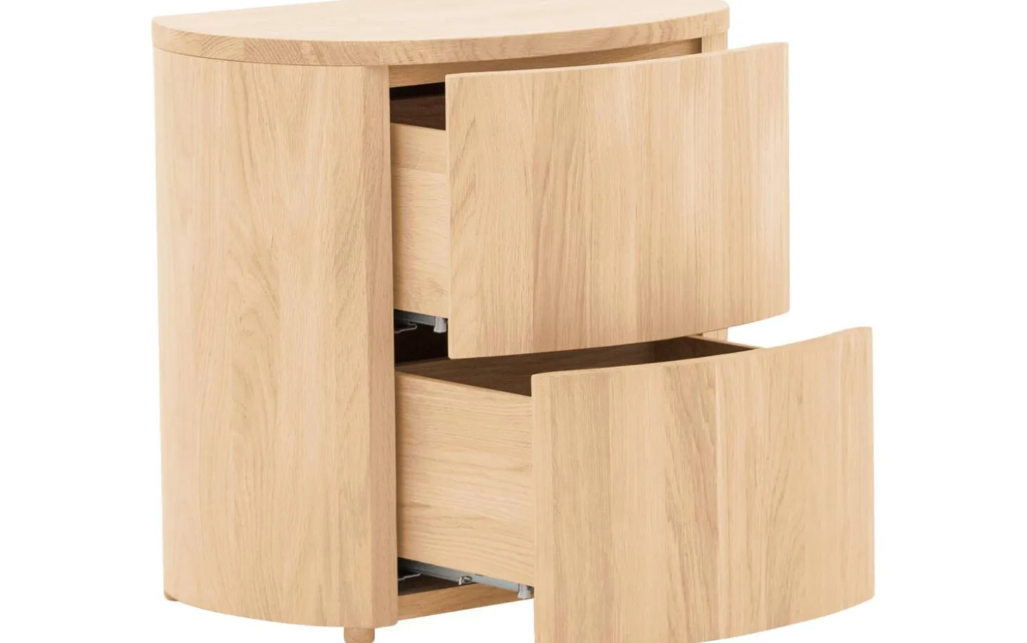 Das Nachtschränkchen Donna zeichnet sich durch seine ansprechenden runden Formen aus. Die Kombination dieses Designs mit robustem Eichenholz verleiht diesem Nachtschränkchen eine schlanke, aber dennoch solide Optik. Das moderne Modell ist aus massivem Eichenholz gefertigt und besticht durch sein warmes, natürliches Flair, das sich in jedes Schlafzimmer integrieren lässt. Dank des Eichenholzes hat dieses Nachtschränkchen zudem eine lange Lebensdauer. Das Nachtschränkchen ist mit einer passenden Kommode und einem passenden Bett aus der Donna-Kollektion kombinierbar.