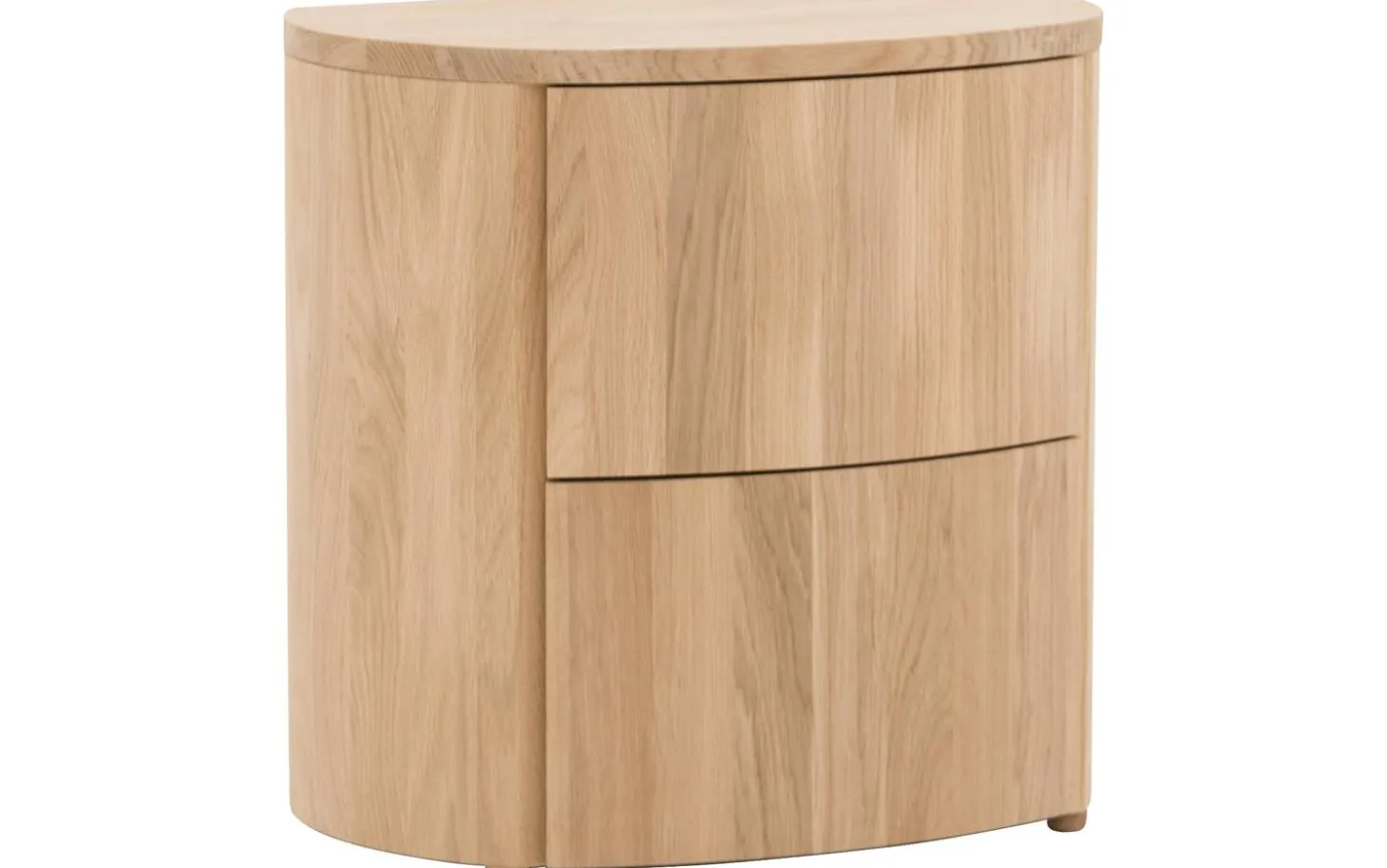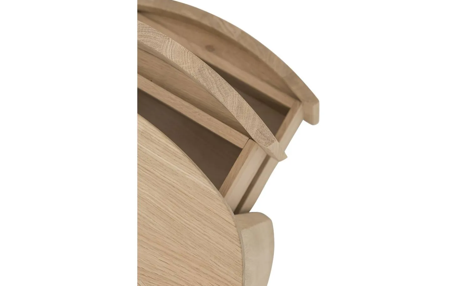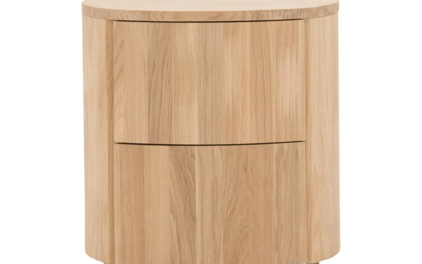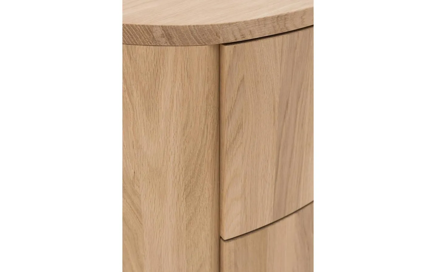 Das Nachtschränkchen Donna zeichnet sich durch seine ansprechenden runden Formen aus. Die Kombination dieses Designs mit robustem Eichenholz verleiht diesem Nachtschränkchen eine schlanke, aber dennoch solide Optik. Das moderne Modell ist aus massivem Eichenholz gefertigt und besticht durch sein warmes, natürliches Flair, das sich in jedes Schlafzimmer integrieren lässt. Dank des Eichenholzes hat dieses Nachtschränkchen zudem eine lange Lebensdauer. Das Nachtschränkchen ist mit einer passenden Kommode und einem passenden Bett aus der Donna-Kollektion kombinierbar.