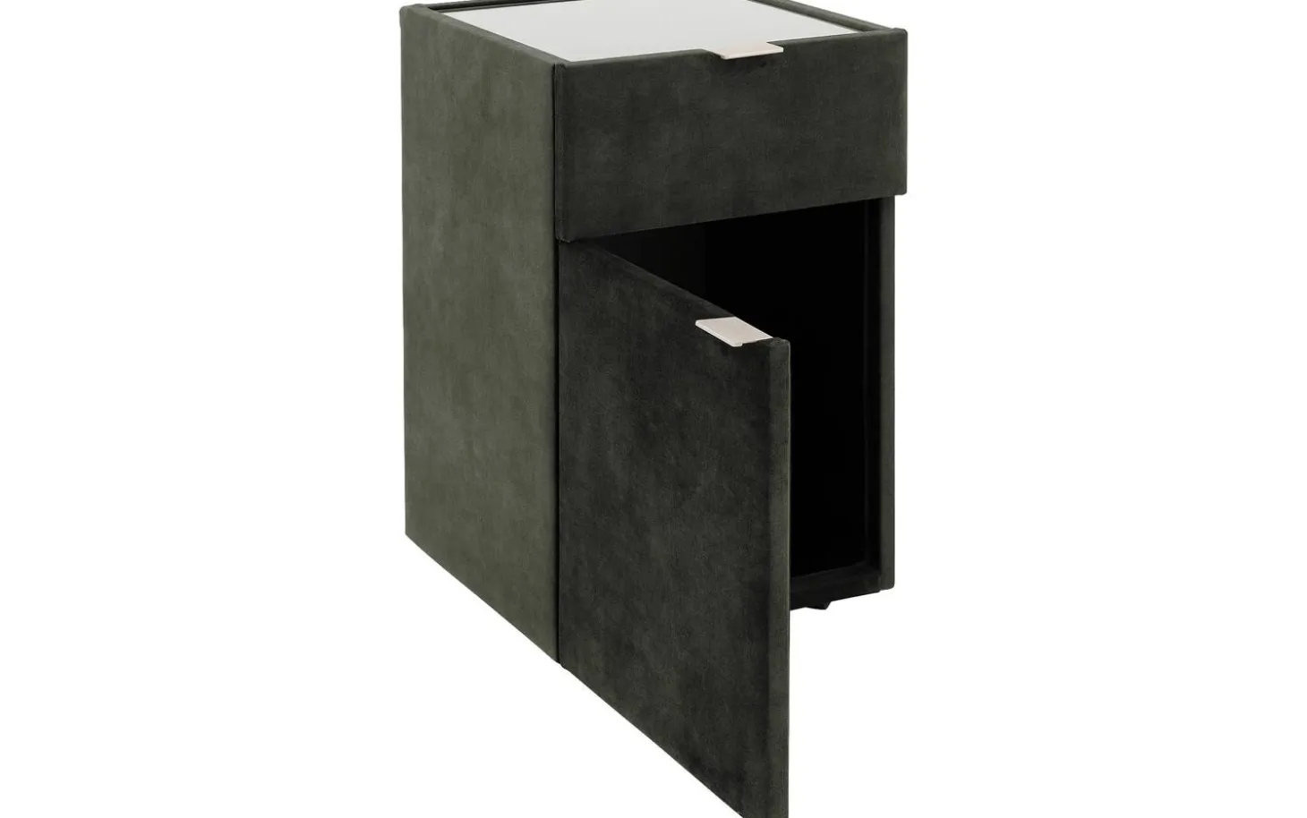 Mit dem Nachtschränkchen Briljant Luxe bringen Sie Stil und modernes Design in Ihr Schlafzimmer. Durch den Stoffbezug in Kombination mit der Oberplatte aus Glas ist dieses Nachtschränkchen ein echter Blickfang. Die Oberplatte aus Glas dient dem Nachtschränkchen nicht nur als Schutz, sondern sorgt auch für zusätzliche Stabilität für Gegenstände, die auf dem Nachtschränkchen abgestellt werden. Das Nachtschränkchen Briljant Luxe ist mit einer Schublade und einer Flügeltür versehen, was eine Vielzahl von Aufbewahrungsmöglichkeiten bietet. Ideal für all Ihre persönlichen Gegenstände! Schaffen Sie ein ansprechendes Gesamtbild, indem Sie das Nachtschränkchen Brilliant Luxe mit dem Boxspringbett Brilliant Luxe kombinieren.