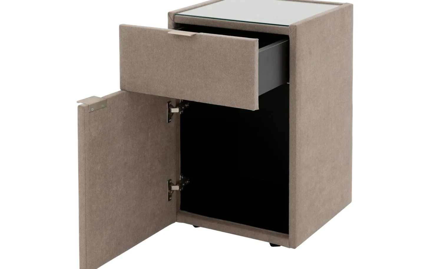 Mit dem Nachtschränkchen Briljant Luxe bringen Sie Stil und modernes Design in Ihr Schlafzimmer. Durch den Stoffbezug in Kombination mit der Oberplatte aus Glas ist dieses Nachtschränkchen ein echter Blickfang. Die Oberplatte aus Glas dient dem Nachtschränkchen nicht nur als Schutz, sondern sorgt auch für zusätzliche Stabilität für Gegenstände, die auf dem Nachtschränkchen abgestellt werden. Das Nachtschränkchen Briljant Luxe ist mit einer Schublade und einer Flügeltür versehen, was eine Vielzahl von Aufbewahrungsmöglichkeiten bietet. Ideal für all Ihre persönlichen Gegenstände! Schaffen Sie ein ansprechendes Gesamtbild, indem Sie das Nachtschränkchen Brilliant Luxe mit dem Boxspringbett Brilliant Luxe kombinieren.