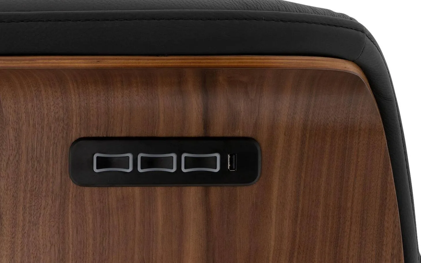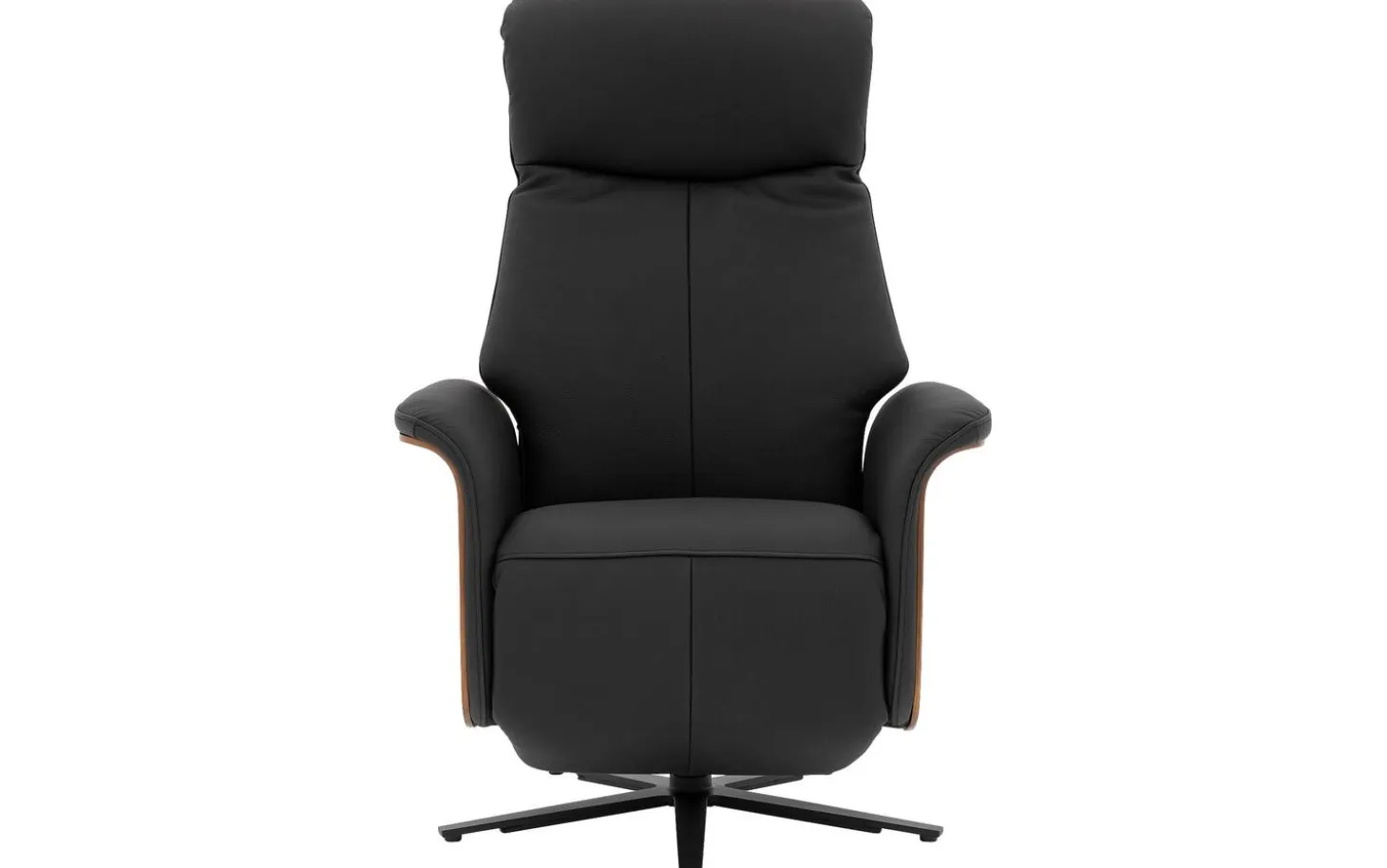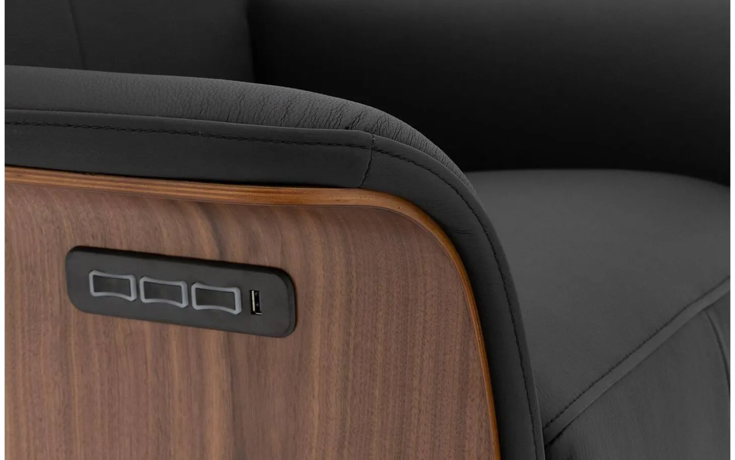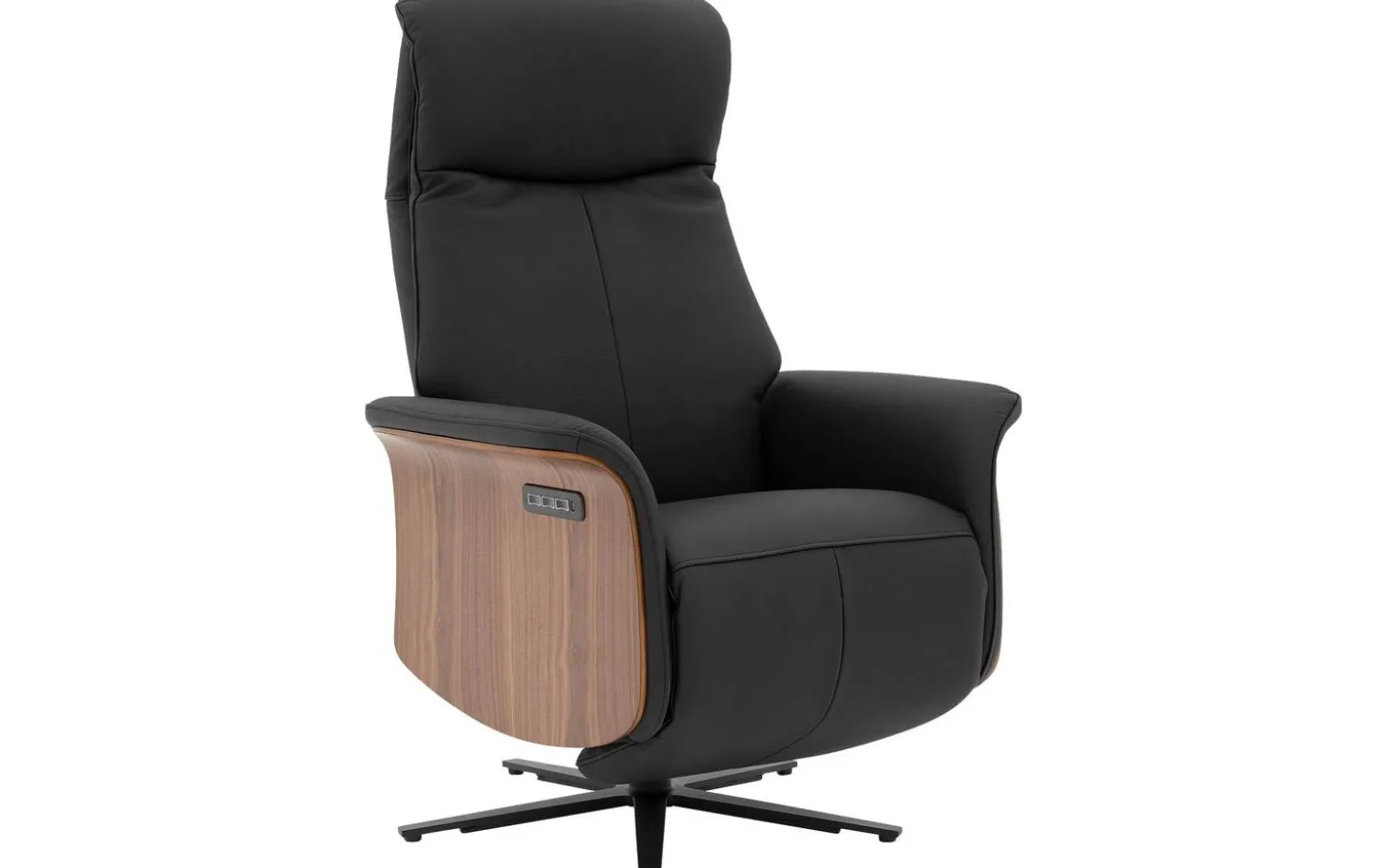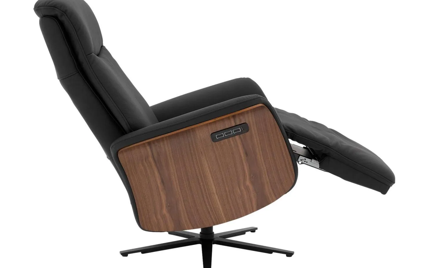 Genießen Sie nach einem langen Tag entspannende Momente im Relaxsessel Finesse. Der Bezug aus schwarzem Masterleder in Kombination mit den Seitenteilen aus Holz und dem schwarzen Sternfuß verleihen dem Sessel eine luxuriöse und schicke Optik. Ein echter Blickfang für Ihr Interieur! Dieser Relaxsessel besticht aber nicht nur optisch. Die solide Nosagfederung in der Sitzfläche und die hochwertige Polsterung garantieren optimalen Sitzkomfort. Über das Bedienfeld an der Seite lässt sich der Sessel mithilfe eines dreimotorigen Antriebs vollständig elektrisch verstellen. Dadurch können sowohl die Rückenlehne als auch die Fußstütze in die gewünschte Position gebracht werden. Dies entlastet den Körper vollständig und gewährleistet maximale Entspannung. Dank der USB-Anschlüsse in den Armlehnen müssen Sie nicht mal mehr aufstehen, wenn der Akku Ihres Smartphones oder Tablets aufgeladen werden muss.