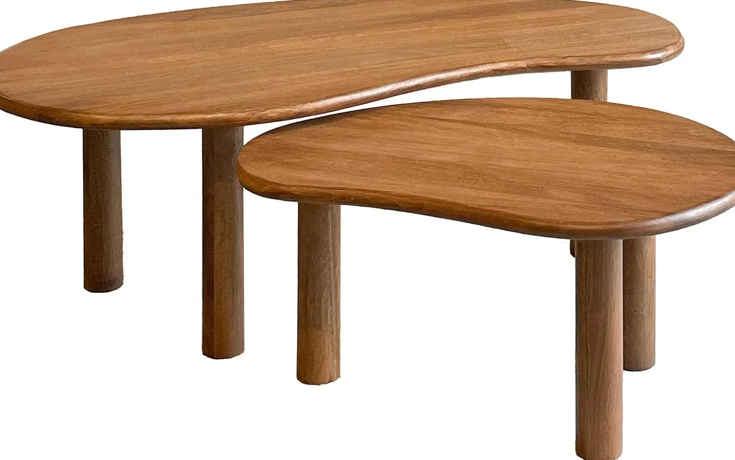 Salontafel Elan heeft een organische vorm die zachtheid uitstraalt. De set bestaat uit twee tafels in verschillende formaten: de grote tafel meet 110 x 60 cm en is 39 cm hoog, de kleine tafel meet 70 x 50 cm en is 35 cm hoog. Door de ronde poten en natuurlijke houtkleur past Elan mooi in een warm, natuurlijk interieur.
