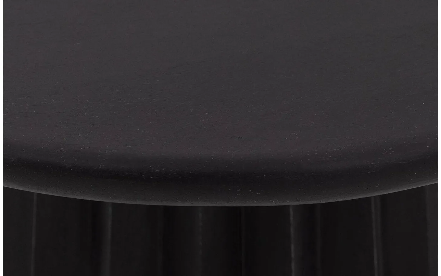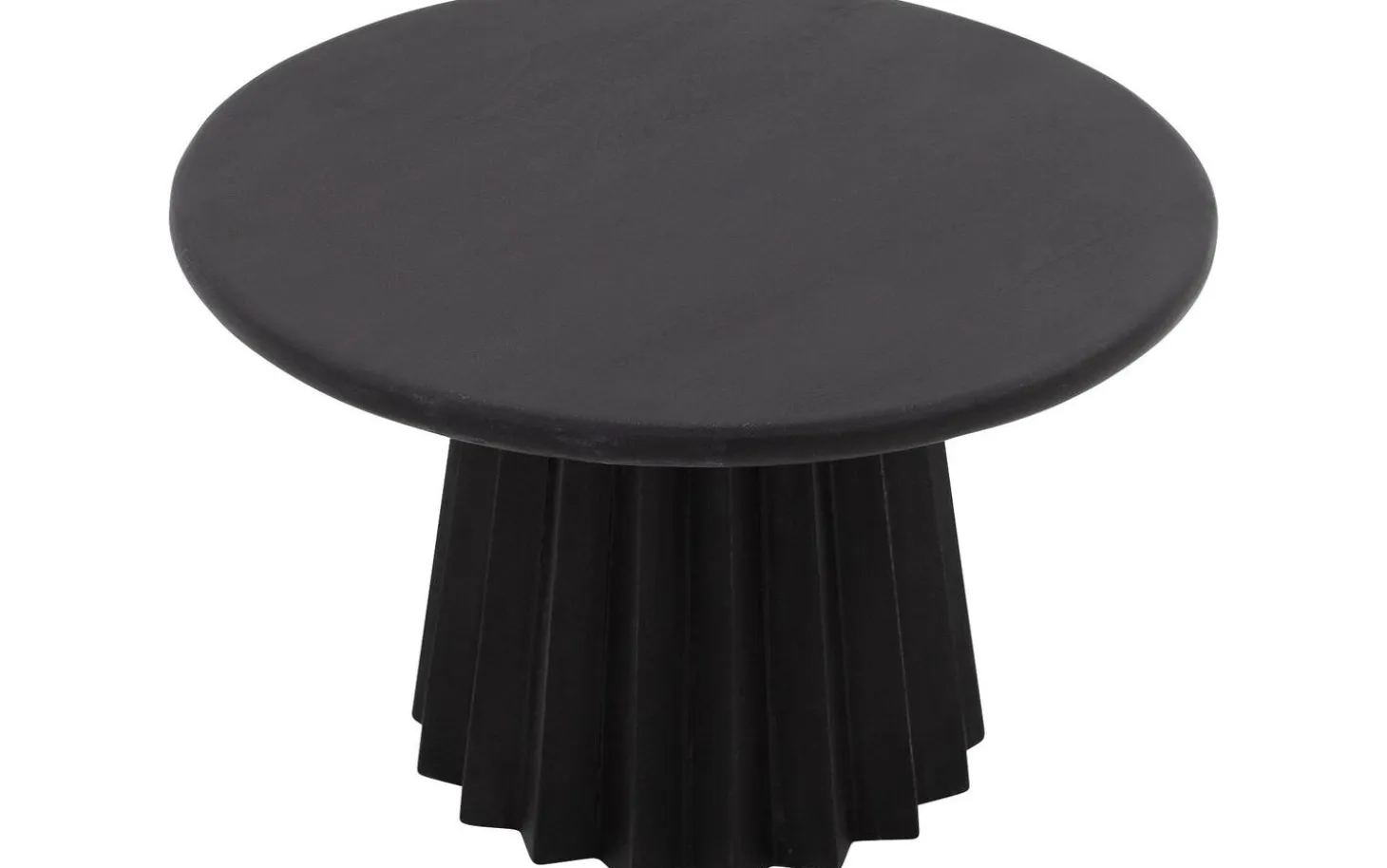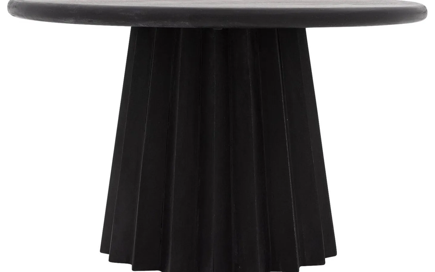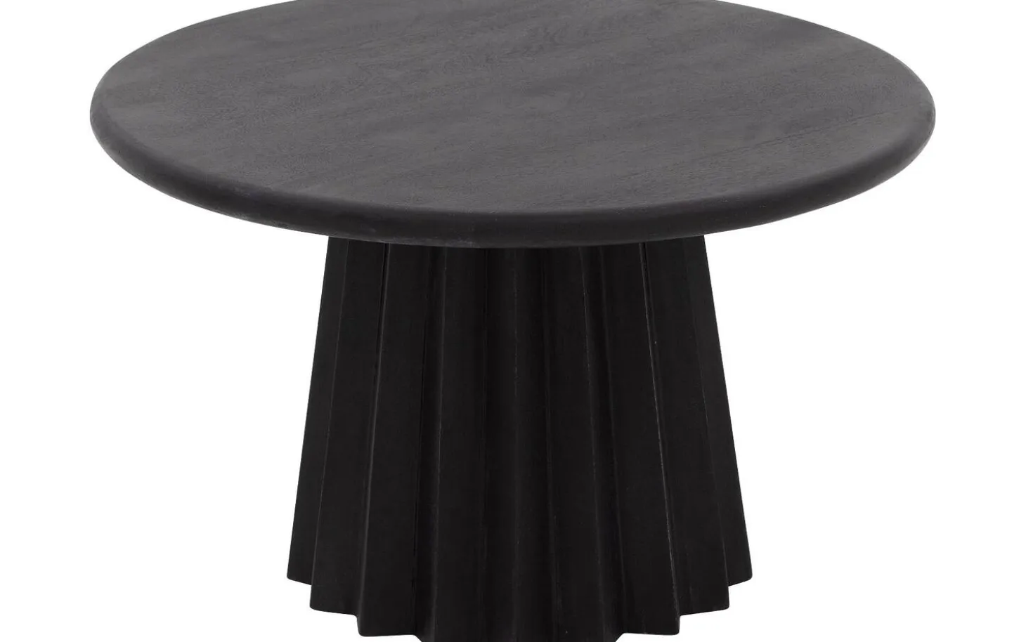 Couchtisch Felicia hat eine schöne runde Form, die für eine sanfte, einladende Atmosphäre sorgt. Der Säulenfuß aus schwarzem Mangoholz verleiht eine klare Basis, während die runde Tischplatte das Ganze freundlich hält. Ideal für gemütliche Momente im Wohnzimmer.