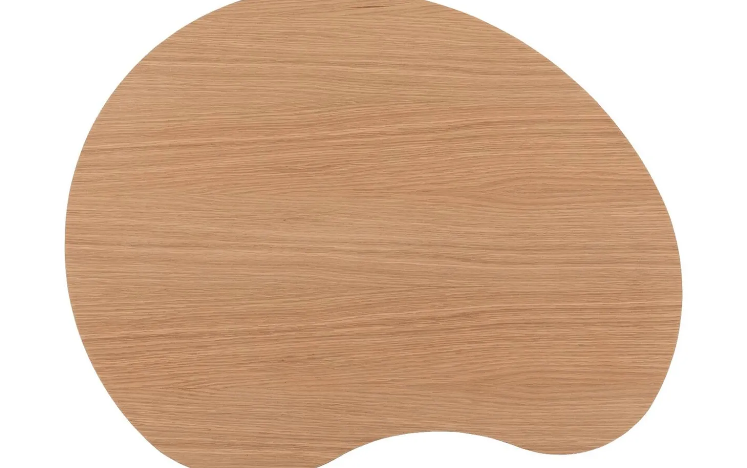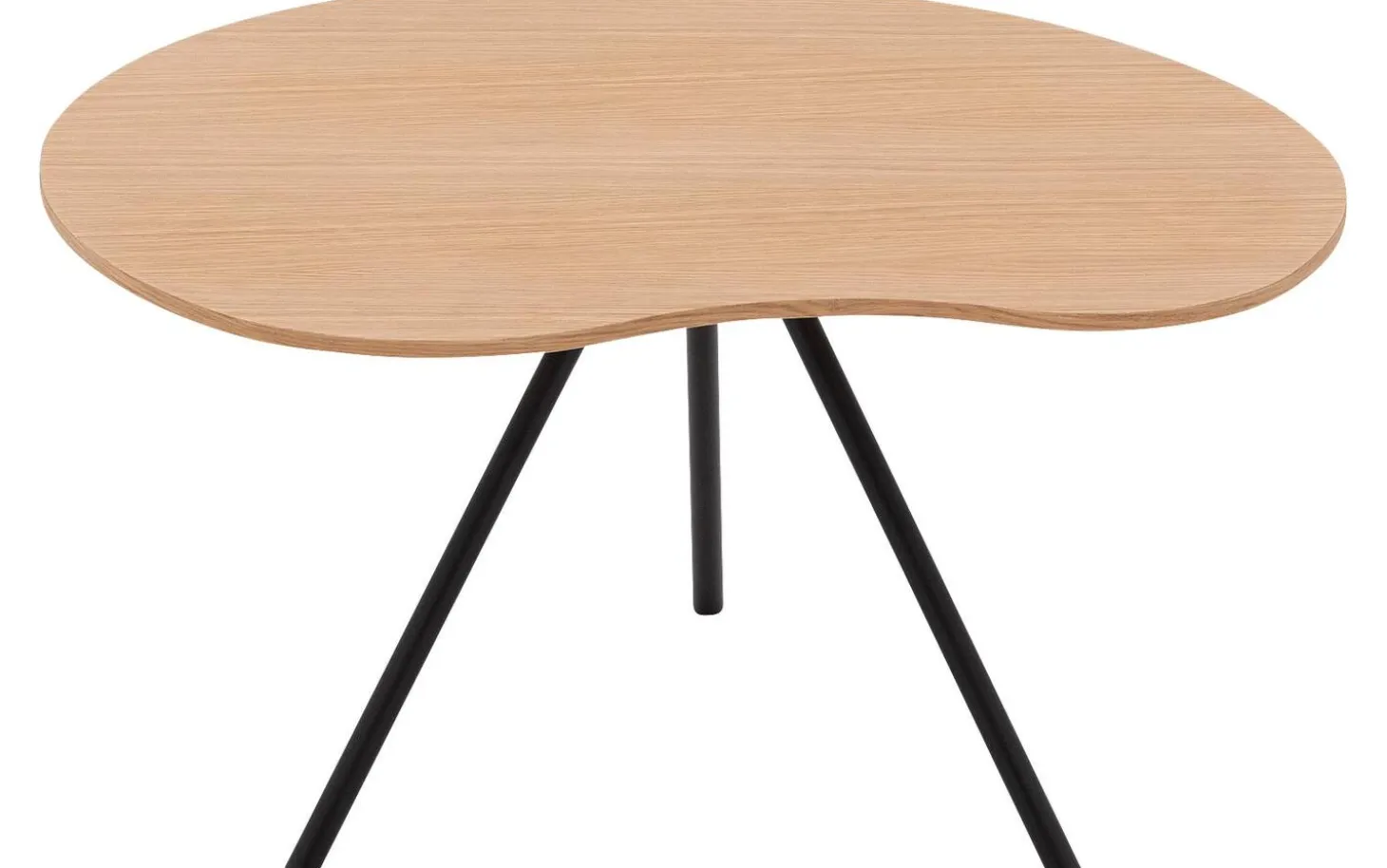 Couchtisch Saya hat eine einzigartige organische Form, die Weichheit und Natürlichkeit ausstrahlt. Der runde schwarze Metallfuß verleiht dem Tisch eine moderne Basis, während das helle Eichenfurnier für Wärme sorgt. Die kompakte Größe macht diesen Couchtisch vielseitig einsetzbar.