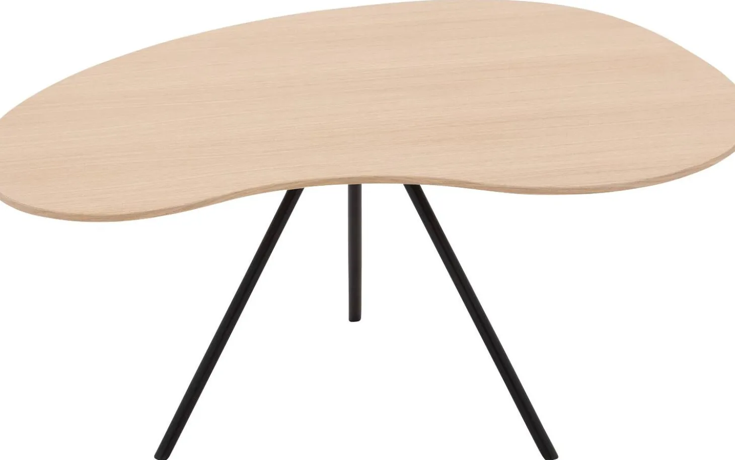 Couchtisch Saya hat eine organische Form, die sanft und einladend wirkt. Der runde Fuß aus schwarz pulverbeschichtetem Metall verleiht dem Tisch eine moderne Basis, während die helle Eichenholzplatte für Wärme sorgt. Diese Kombination passt perfekt in ein zeitgemäßes Interieur.