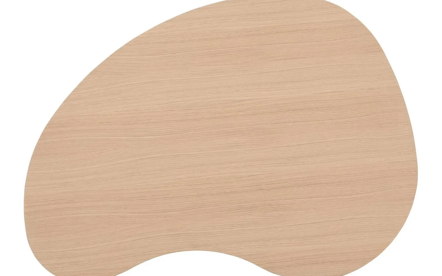 Die Tischplatte ist aus Eichenfurnier gefertigt und hat eine weiße Öl-Veredelung. Diese Behandlung sorgt dafür, dass das Holz seinen natürlichen Charakter behält, aber dennoch vor Flecken und Ringen geschützt ist. Die organischen Kanten verleihen der Platte eine sanfte, nahezu skulpturale Ausstrahlung.