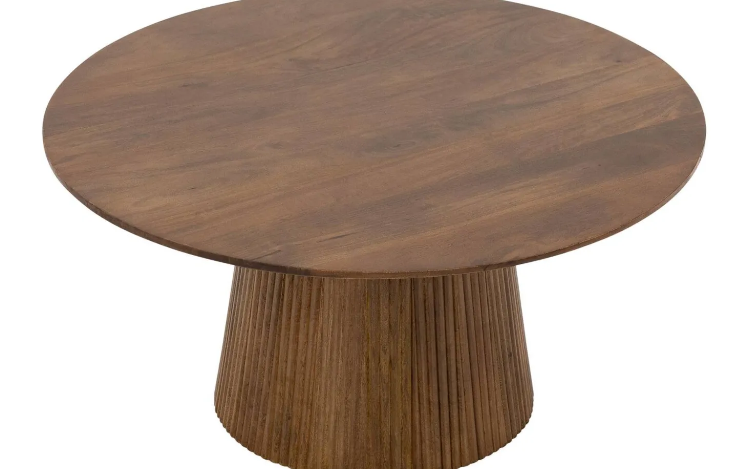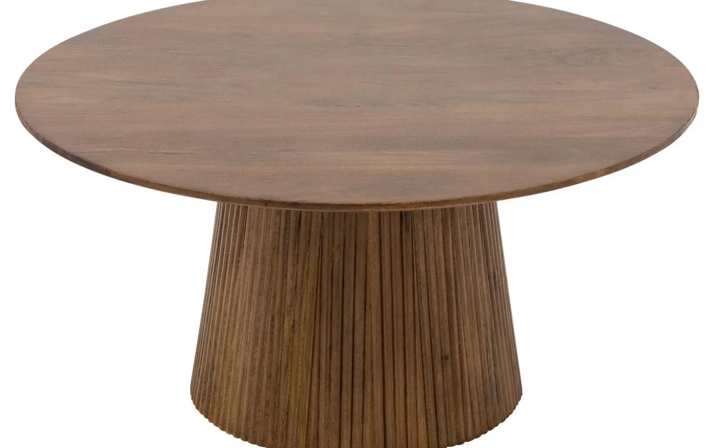 Salontafel Zaro heeft een ronde vorm die de ruimte zacht en open houdt. Het mangohouten blad in warme bruintinten en de gelakte afwerking geven de tafel een natuurlijke en tijdloze uitstraling. De ronde houten poten sluiten mooi aan bij het organische karakter van het ontwerp.
