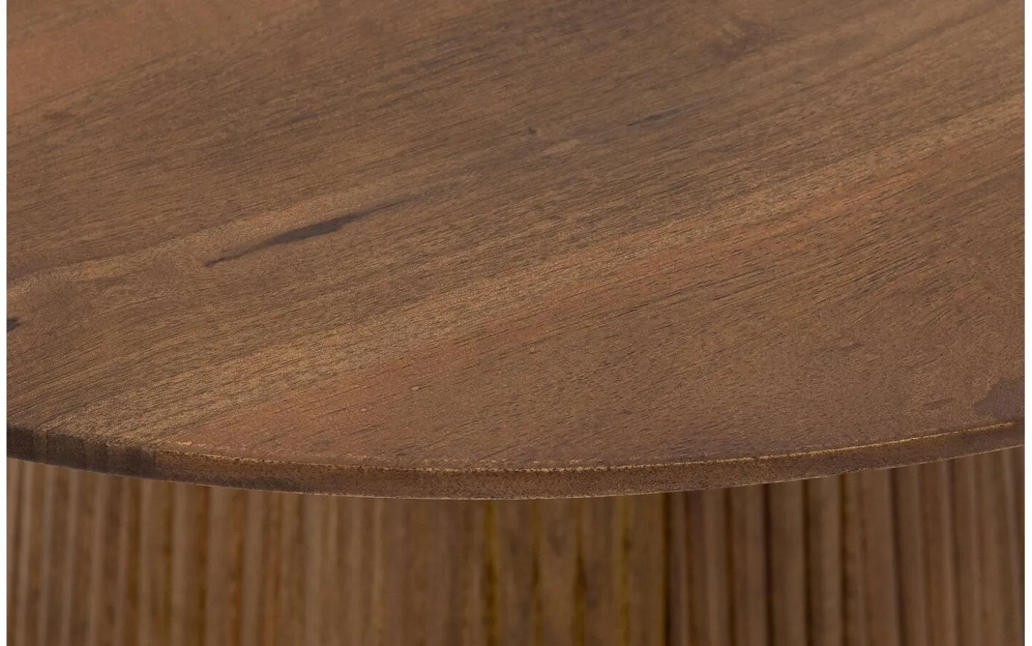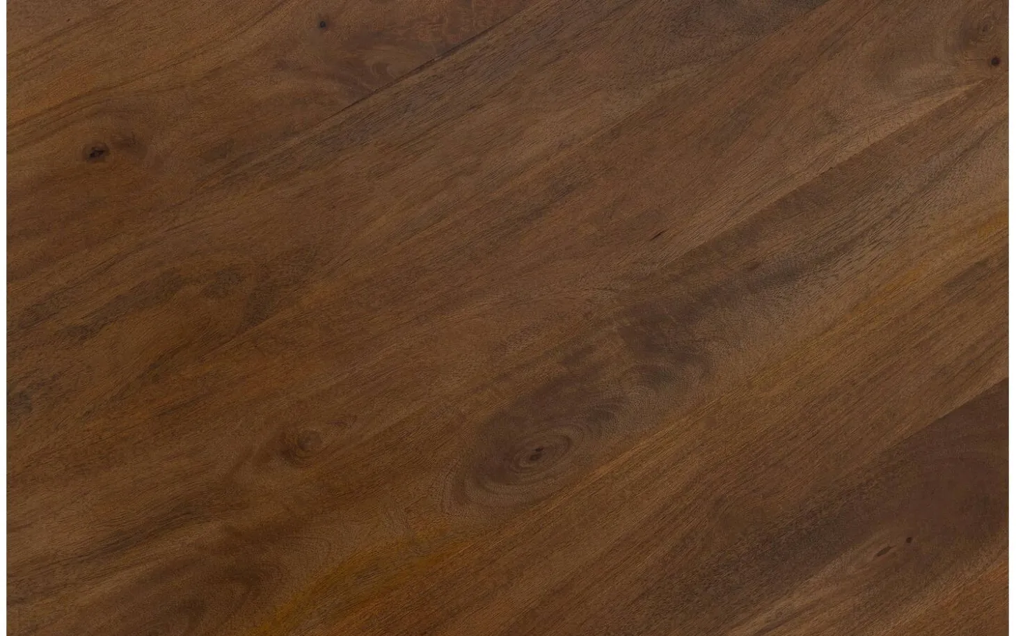 Het tafelblad is gemaakt van massief mangohout met een gelakte afwerking. Deze laklaag beschermt het hout tegen kringen en vlekken, en maakt de tafel makkelijker schoon te maken. Het mangohout heeft een warme bruine kleur met een natuurlijke tekening die per tafel verschilt.