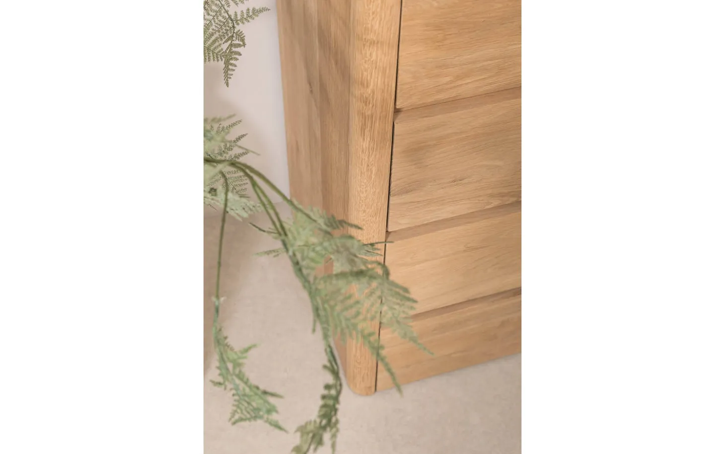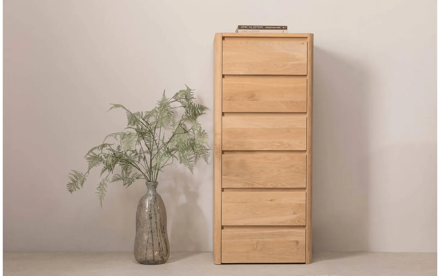 Sie suchen einen Schubladenschrank mit natürlicher Optik und viel Stauraum? Dann ist die Kommode Bibi genau das richtige Modell für Sie! Diese ansprechende Kommode aus Eichenholz verfügt über gleich sechs praktische Schubladen, in denen Sie Ihre Siebensachen ordentlich aufbewahren können. Die Maserung und die Farbschattierungen des Holzes verleihen der Kommode Bibi eine natürliche Optik. Eichenholz ist außerdem ein langlebiges Produkt, sodass Sie jahrelang Freude an Bibi haben werden. Kombinieren Sie die Kommode Bibi mit anderen Möbeln aus der Serie Bibi, um auch den Rest Ihres Schlafzimmers in dieses natürliche und ruhige Ambiente zu hüllen.