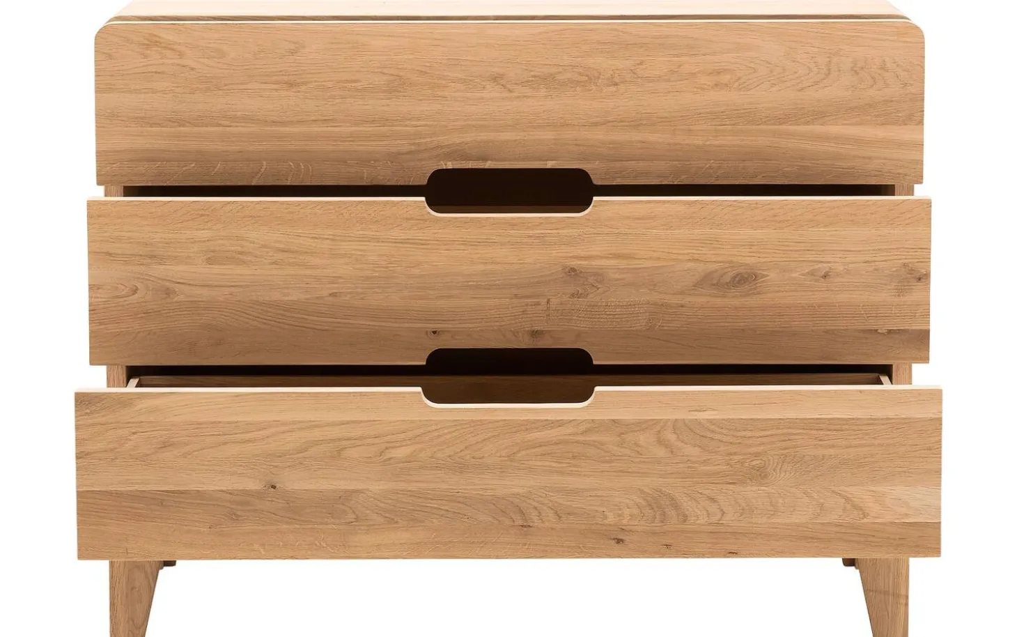 Curve ist eine Kommode mit unverwechselbarem Charakter. Die Kommode mit 3 Schubladen wird mit größter Sorgfalt aus langlebigem Eichenholz gefertigt. Die einzigartigen runden Formen sind ein Beweis großartigen fachmännischen Könnens. Die Schubladen des Schränkchens sind außerdem mit einem Soft-Closing-System ausgestattet. Dieses System gewährleistet ein leichtes und geräuschloses Schließen der Schubladen. Schaffen Sie jetzt die perfekte gemütliche Atmosphäre in Ihrem Schlafzimmer und kombinieren Sie die Kommode Curve mit anderen Möbelstücken aus der Serie Curve.