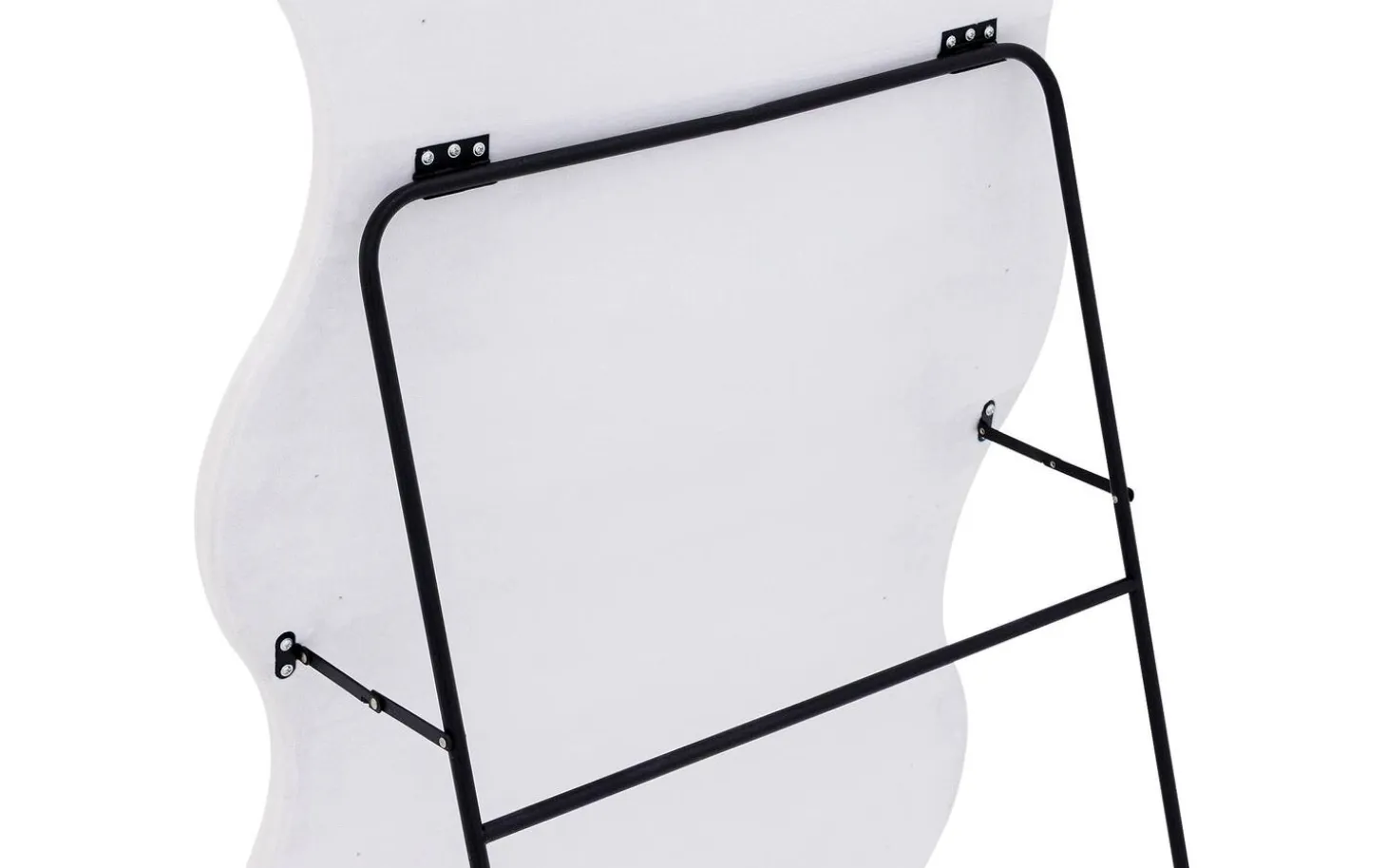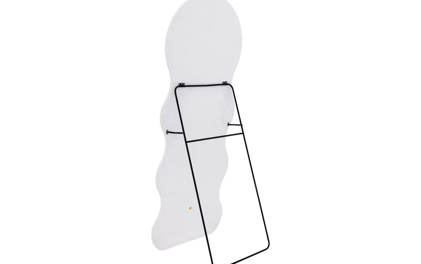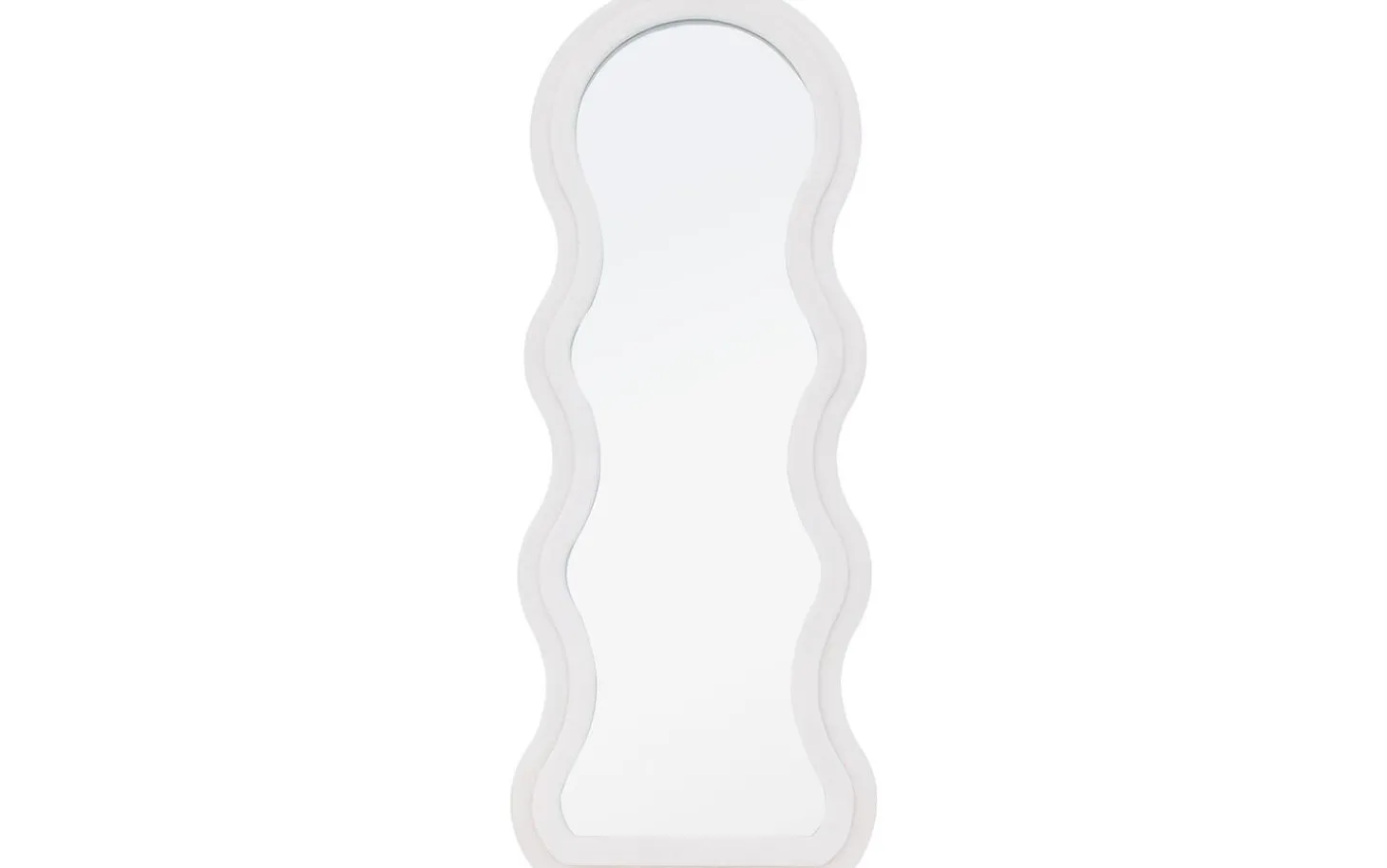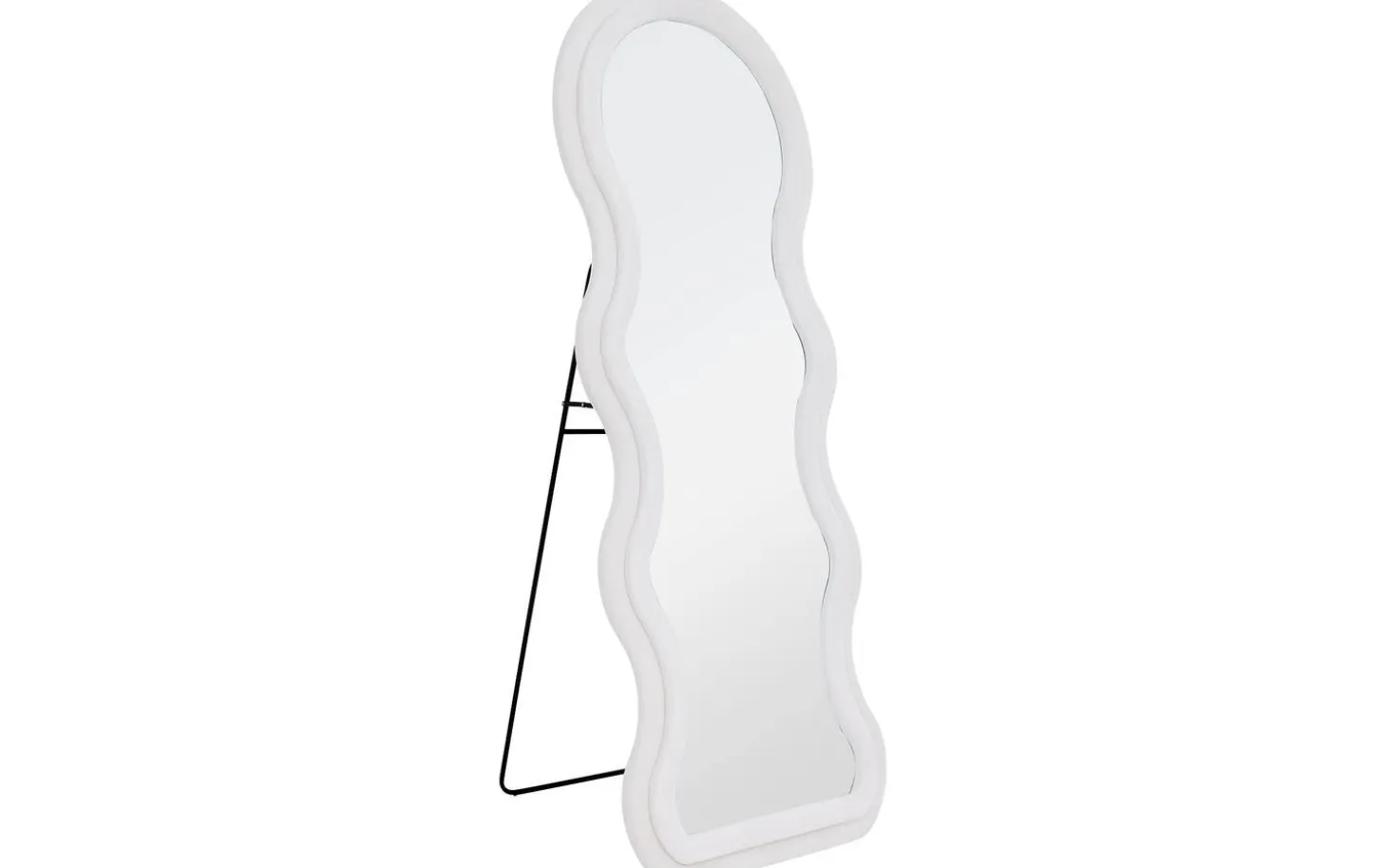 Standspiegel Bats bildet einen echten Blickfang in Ihrem Interieur mit seiner organischen, wellenförmigen Form, die an ein künstlerisches Kunstwerk erinnert. Dieser besondere Spiegel von 60 x 160 cm kombiniert klares Spiegelglas mit einem eleganten weißen Rahmen, getragen von einem schlichten schwarzen Metallgestell. Die fließenden Linien des weißen Glasrahmens schaffen einen spielerischen Kontrast zu den schlichten schwarzen Beinen, wodurch ein perfektes Gleichgewicht zwischen modernem Design und organischen Formen entsteht.