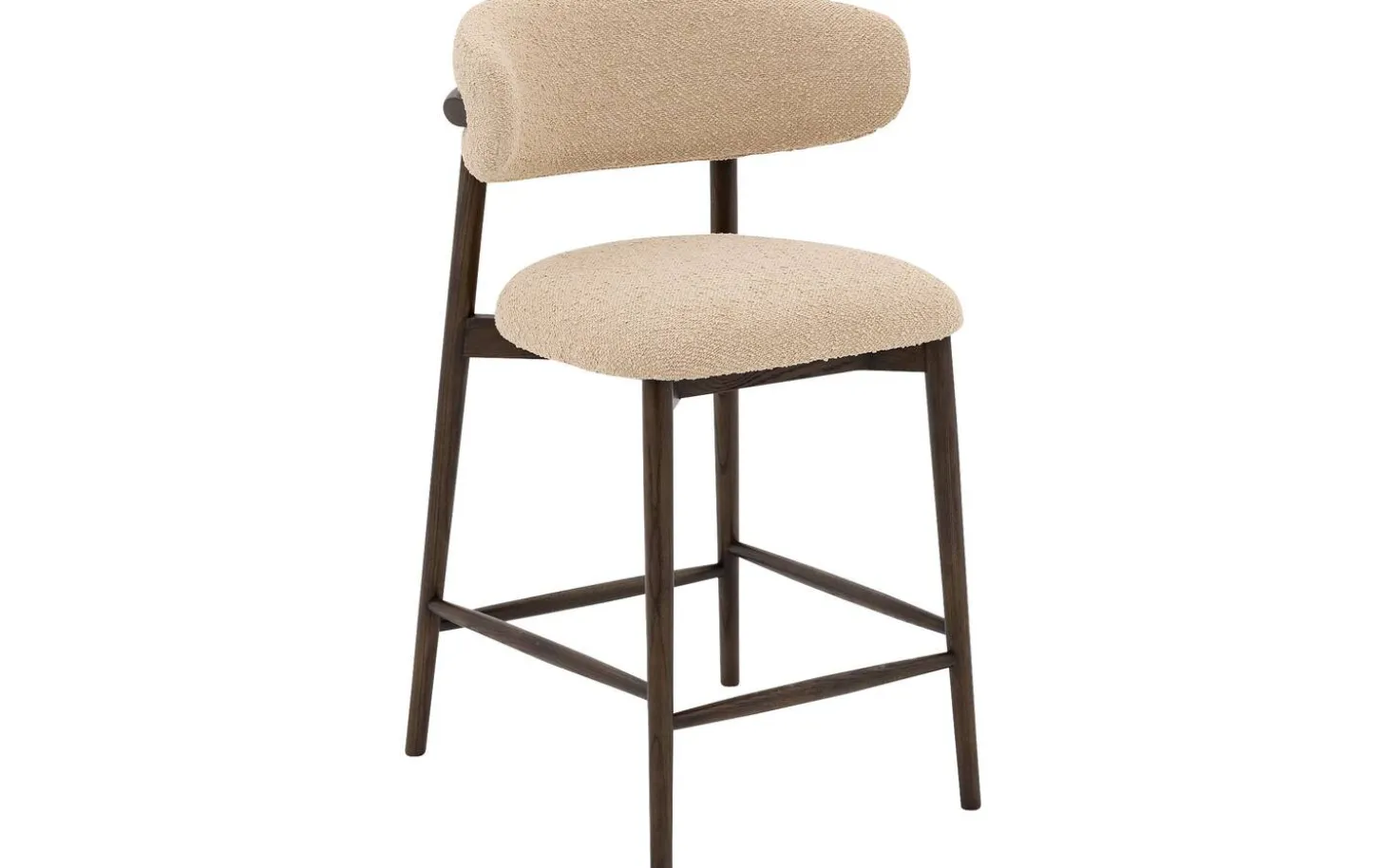 Bekijk counterstoel Diede met beige boucle bekleding. Deze stoel van 67 cm hoog is perfect voor aan de keukenbar of hoge eettafel. De zachte boucle stof geeft de counterstoel een warme en knusse uitstraling, terwijl de donkerbruine gelakte poten zorgen voor een natuurlijke en landelijke uitstraling. Ideaal voor gezellige momenten aan de bar.