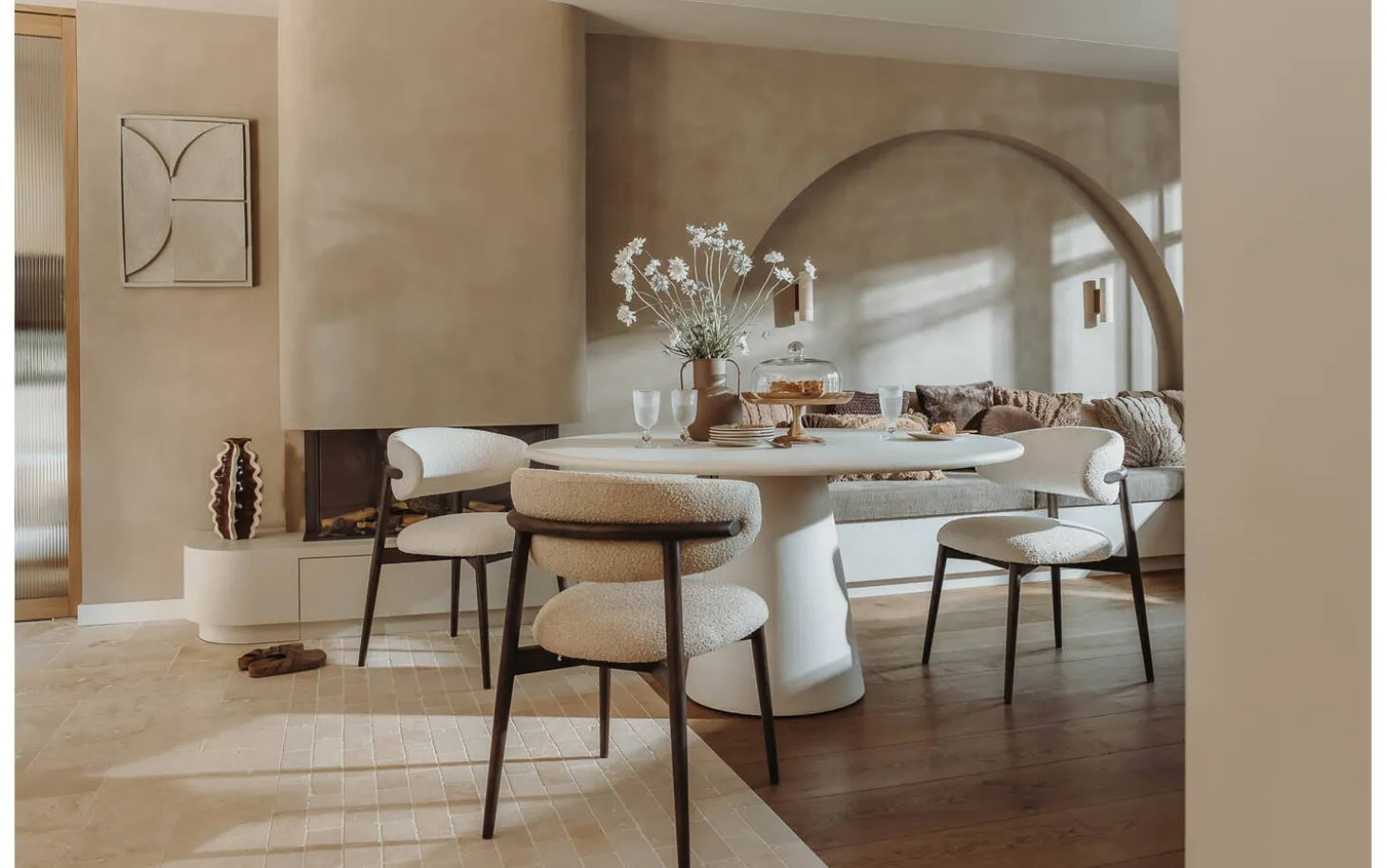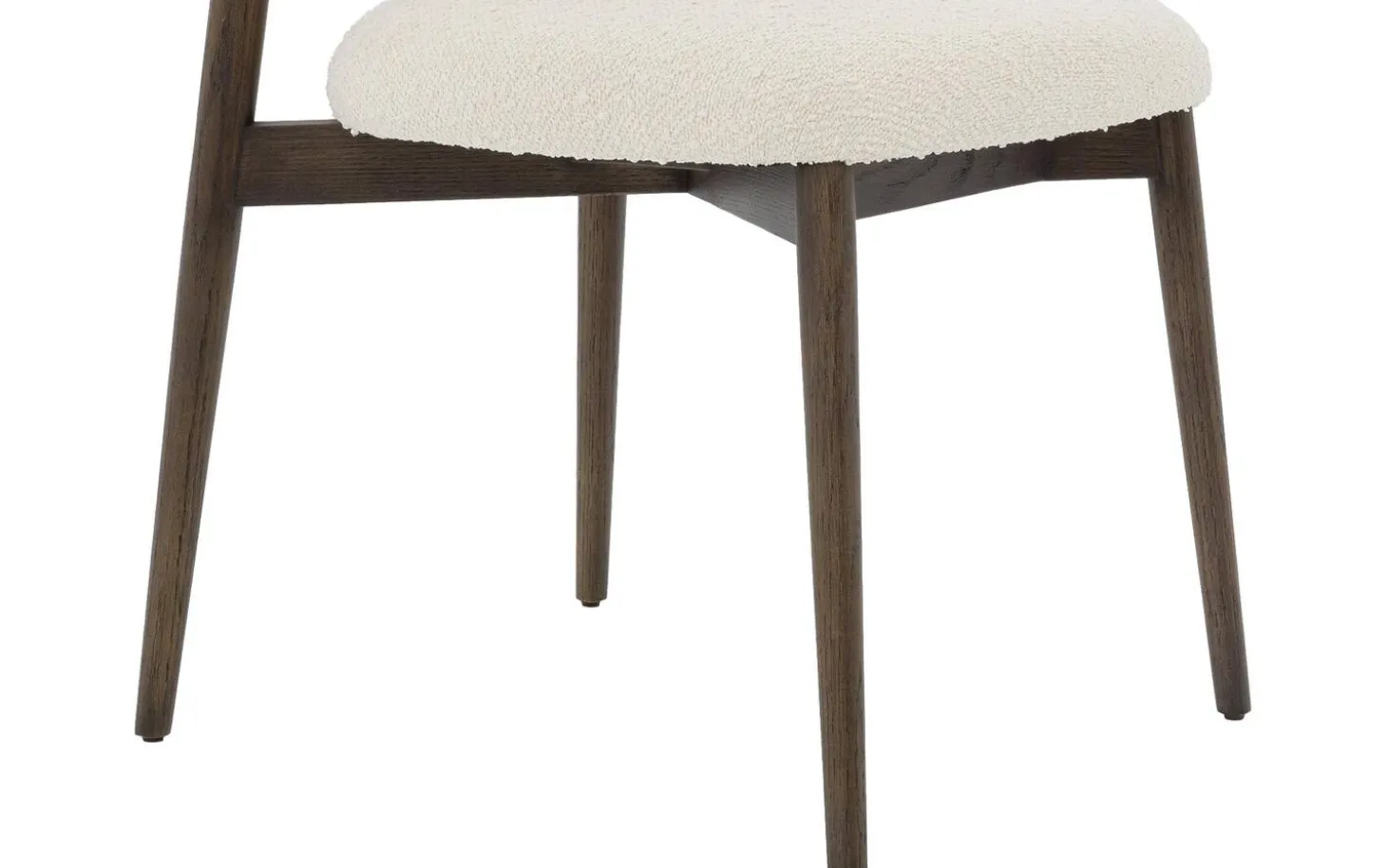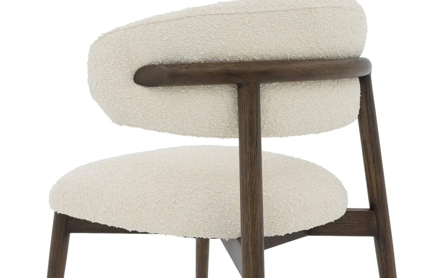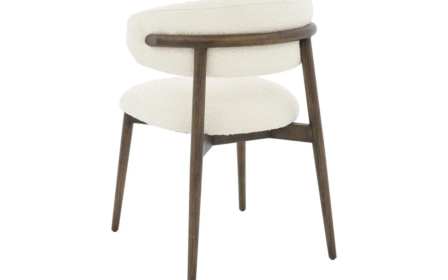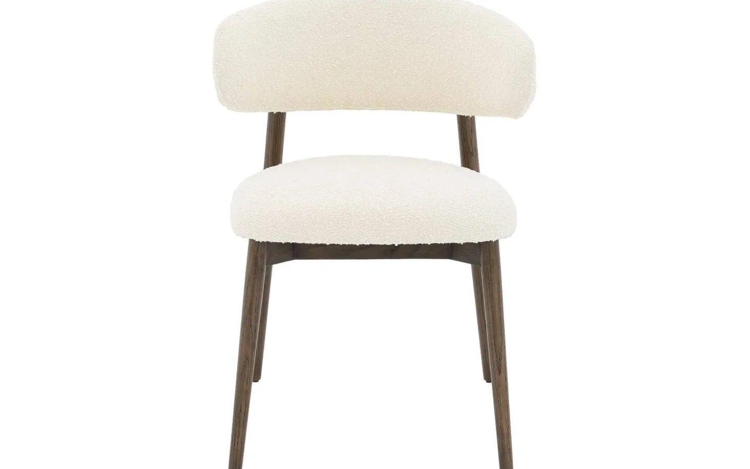 Der beige Bouclé-Stoff verleiht dem Esszimmerstuhl Diede eine weiche Textur, die zum Anfassen einlädt. Der Stoff hat eine verspielte Struktur, die dem Stuhl Tiefe und Charakter verleiht. Die dunkelbraunen Holzbeine bilden einen schönen Kontrast zur hellen Polsterung.