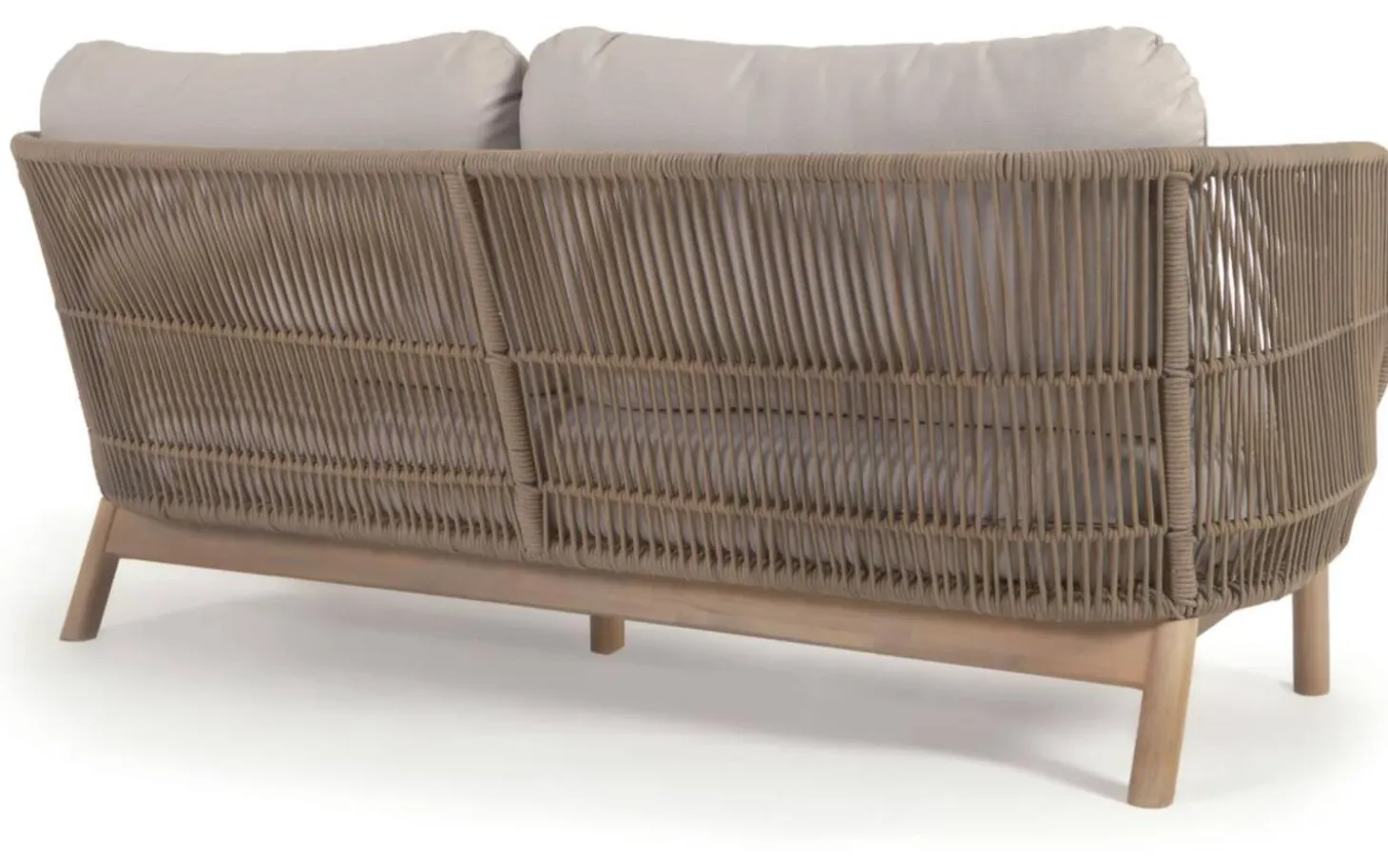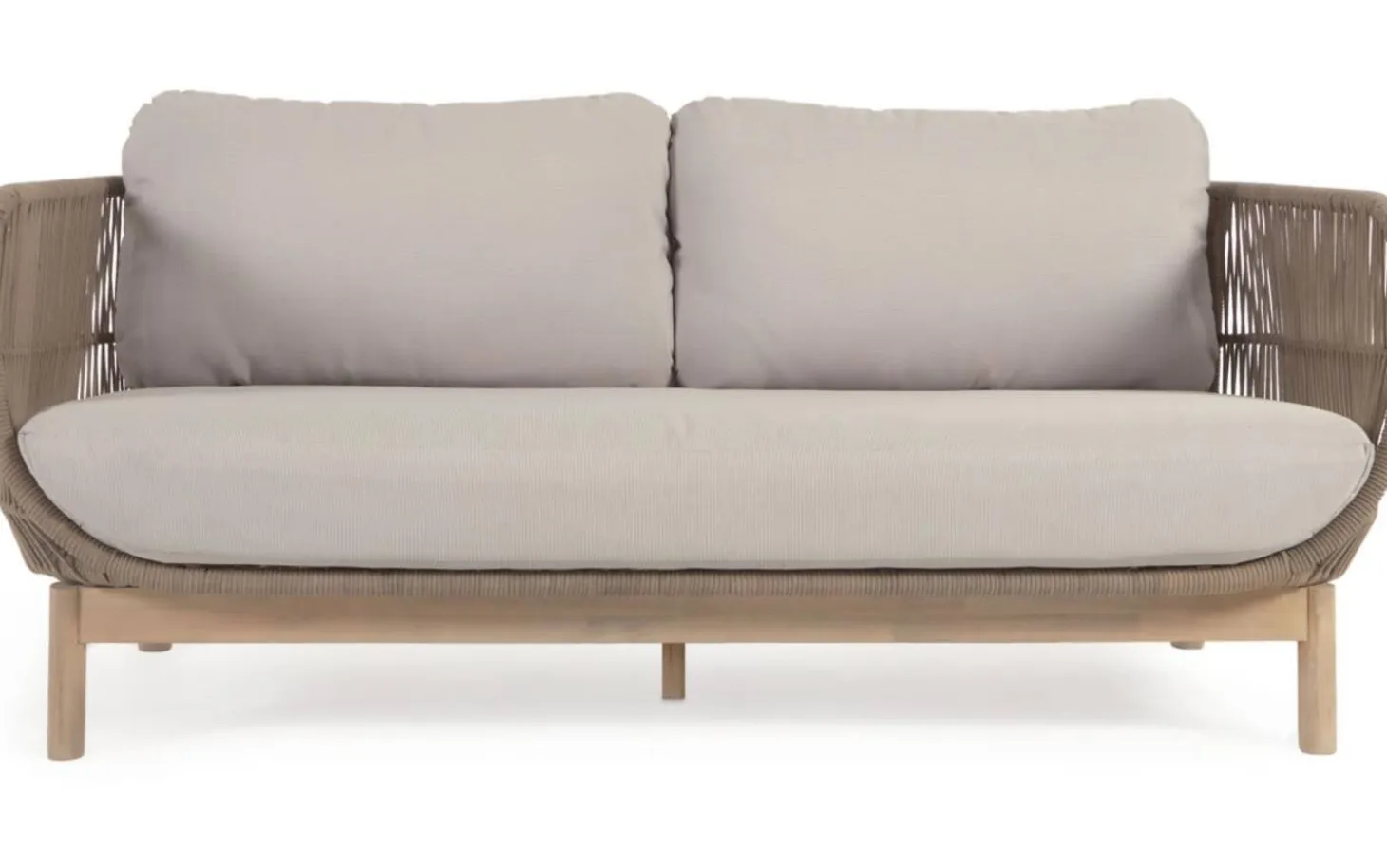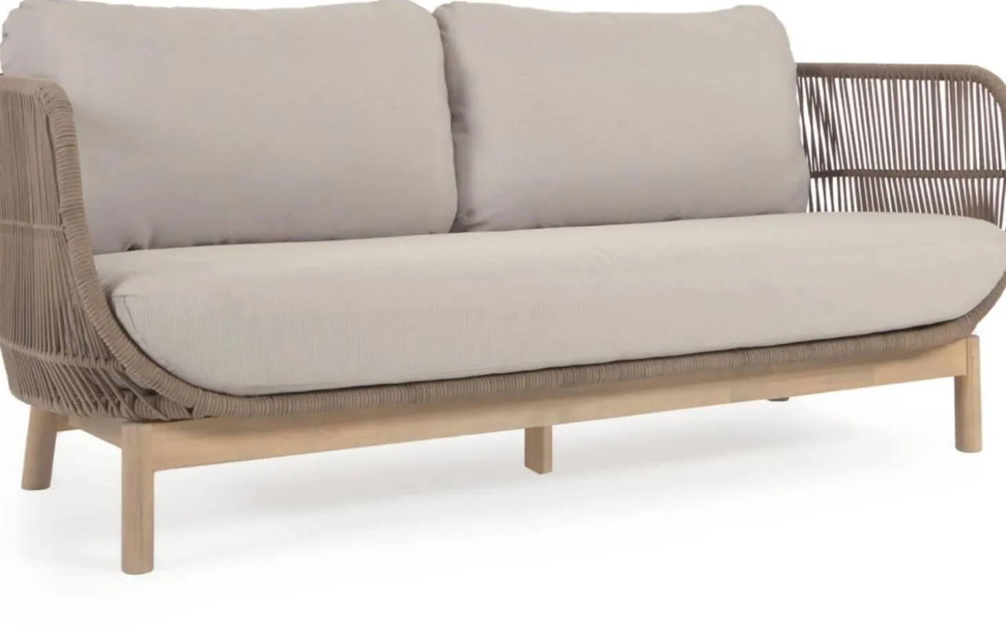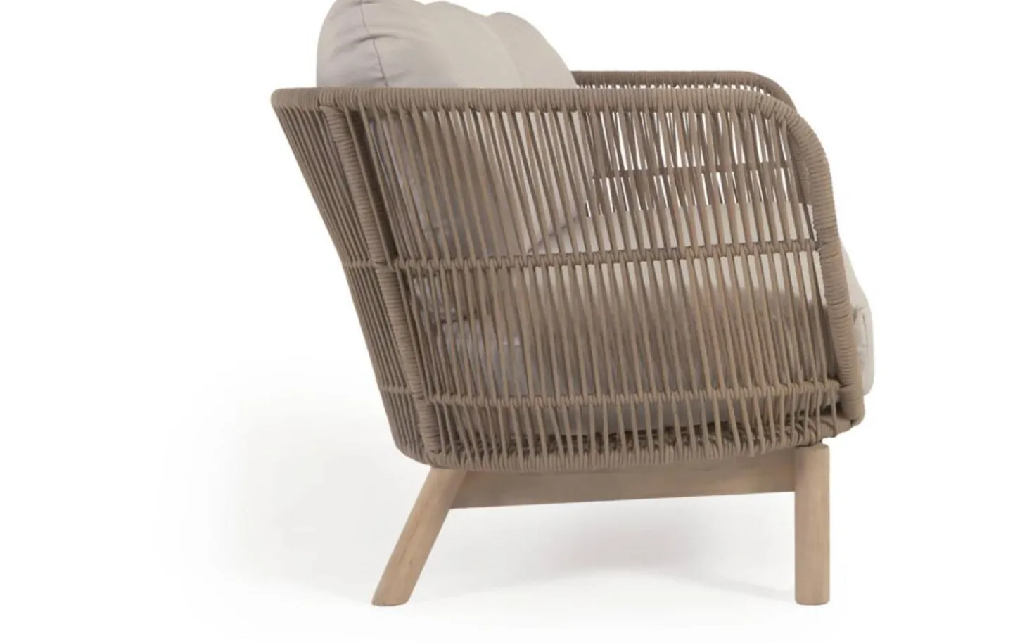 Het acaciahouten frame geeft deze loungebank een natuurlijke en warme look. De grof geweven stof in touwbeige zorgt voor een speelse structuur en robuuste uitstraling. Het zachte materiaal voelt prettig aan en biedt goede ondersteuning tijdens het zitten.