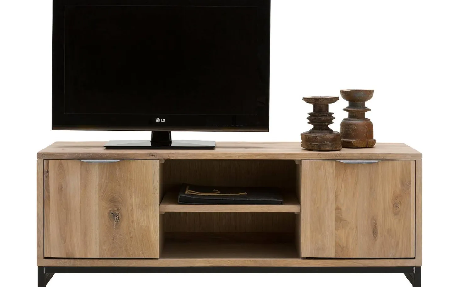 TV-Möbel Max strahlt industriellen Charakter durch seine robuste Eichen-Konstruktion mit metallenen Akzenten aus. Die unbehandelte Oberfläche verleiht dem Holz seinen natürlichen, authentischen Look – perfekt für ein robustes und zugleich warmes Interieur. Die kompakten Abmessungen (135 x 50 x 40 cm) machen es für verschiedene Wohnräume geeignet.