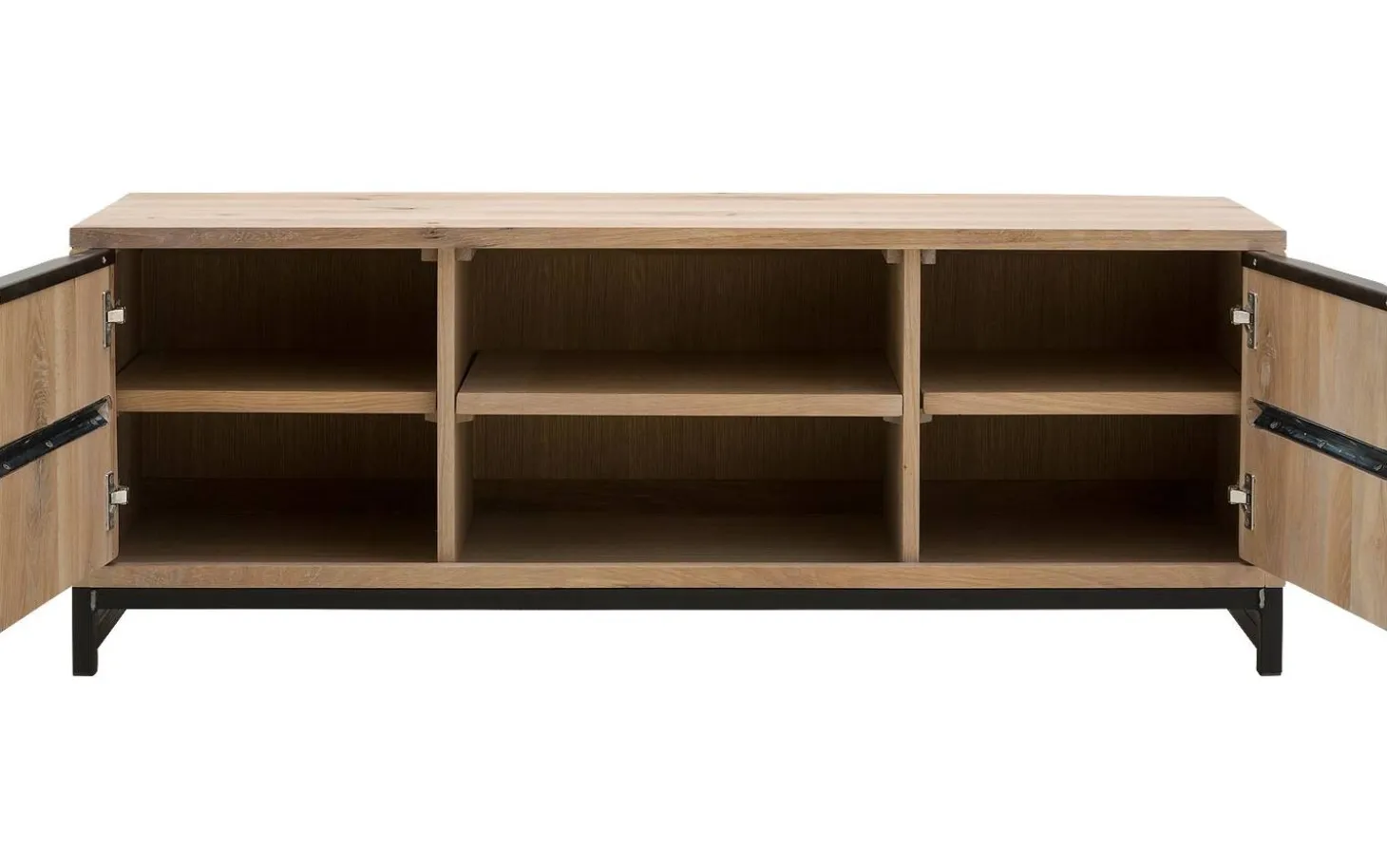 Die beiden Türen schließen dank des Soft-Closing-Systems sanft und geräuschlos – auch wenn Sie sie versehentlich zudrücken. Das offene Fach bietet Platz für Ihren Receiver und Ihre Spielkonsole, während Sie in den geschlossenen Bereichen Unordnung außer Sicht halten.