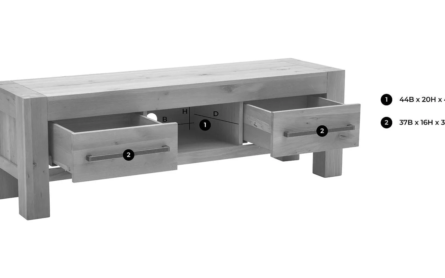 Die zwei geräumigen Schubladen mit Soft-Closing-System schließen immer sanft, auch wenn Sie sie versehentlich zudrücken. Das offene Mittelfach bietet Platz für Ihren TV-Receiver oder Ihre Spielkonsole. Dank der praktischen Kabeldurchführung bleiben alle Kabel ordentlich außer Sicht.