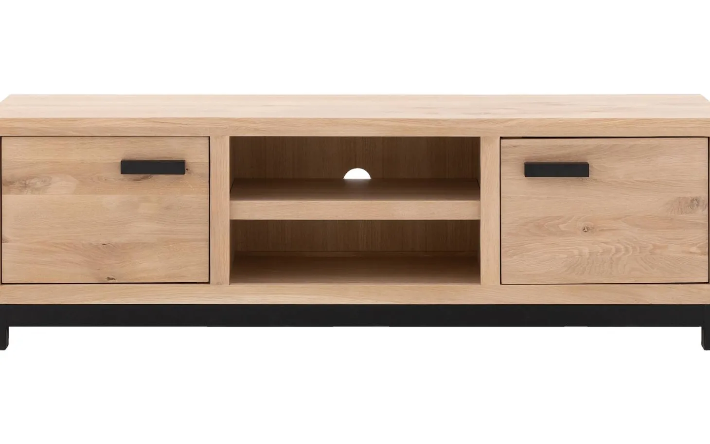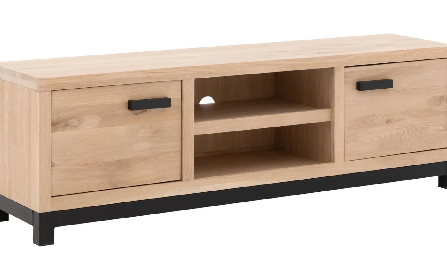 TV-Möbel Sans kombiniert die warme Ausstrahlung von heller Eiche mit einem robusten Metallgestell. Diese Kombination aus natürlichem Holz und industriellen Details verleiht Ihrem Wohnzimmer sofort Charakter. Mit praktischem Stauraum und sanft schließenden Türen ist dies genau das TV-Möbel, das Funktionalität und Stil perfekt miteinander verbindet.