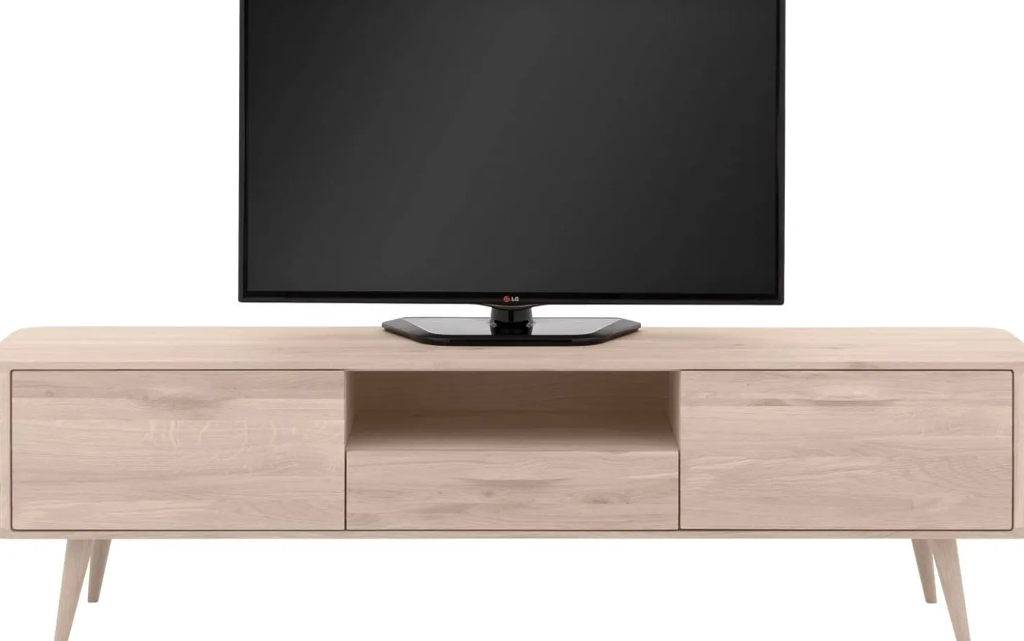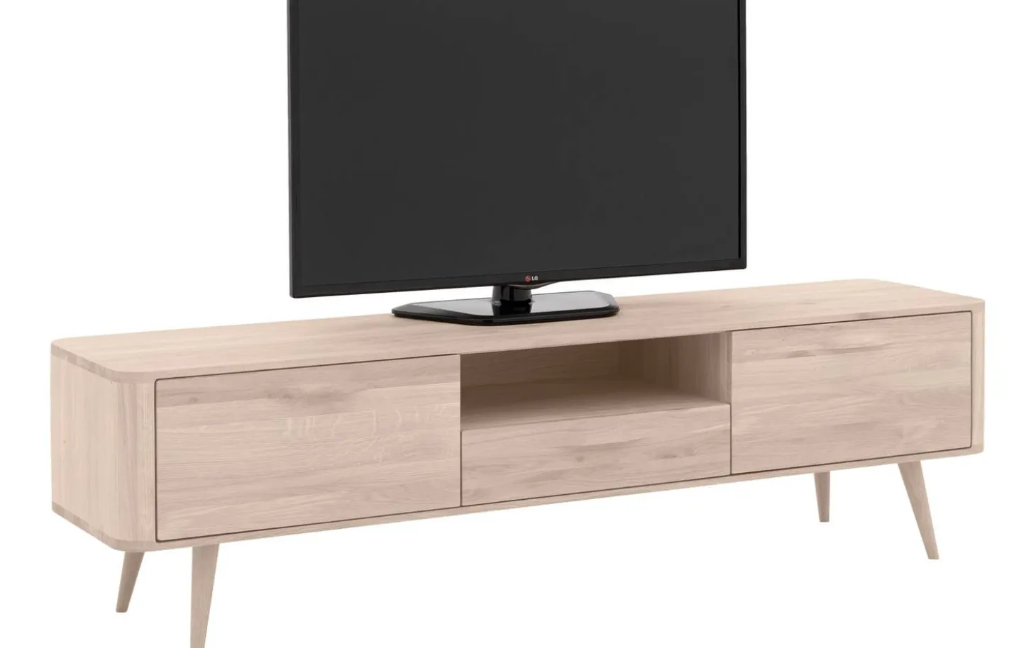 TV Möbel Bjarte kombiniert Retro-Charme mit praktischem Stauraum für Ihr Wohnzimmer. Die weit ausladenden Beine und die cremeweiße Eichen-Verarbeitung verleihen diesem nachhaltigen TV Möbel eine trendige Vintage-Ausstrahlung. Mit praktischen Soft-Closing-Türen und Schubladen halten Sie all Ihre Geräte ordentlich organisiert.