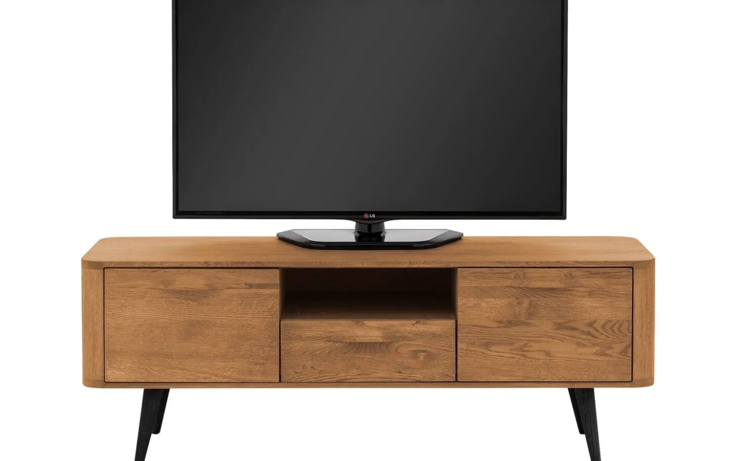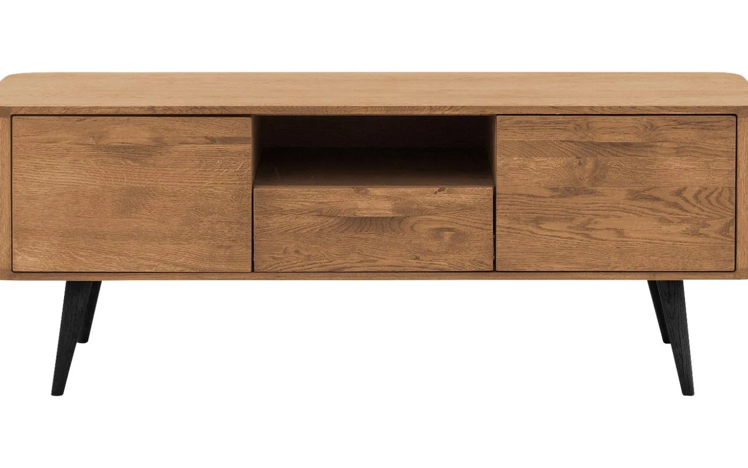 TV-Möbel Bjarte strahlt pure natürliche Wärme aus dank des nachhaltigen Eichenholzes mit seinen einzigartigen Maserungen. Die weit ausladenden Beine verleihen einen verspielten Retro-Touch, der perfekt zu sowohl modernen als auch klassischen Einrichtungen passt. Ein Blickfang, der Charakter in Ihr Wohnzimmer bringt.
