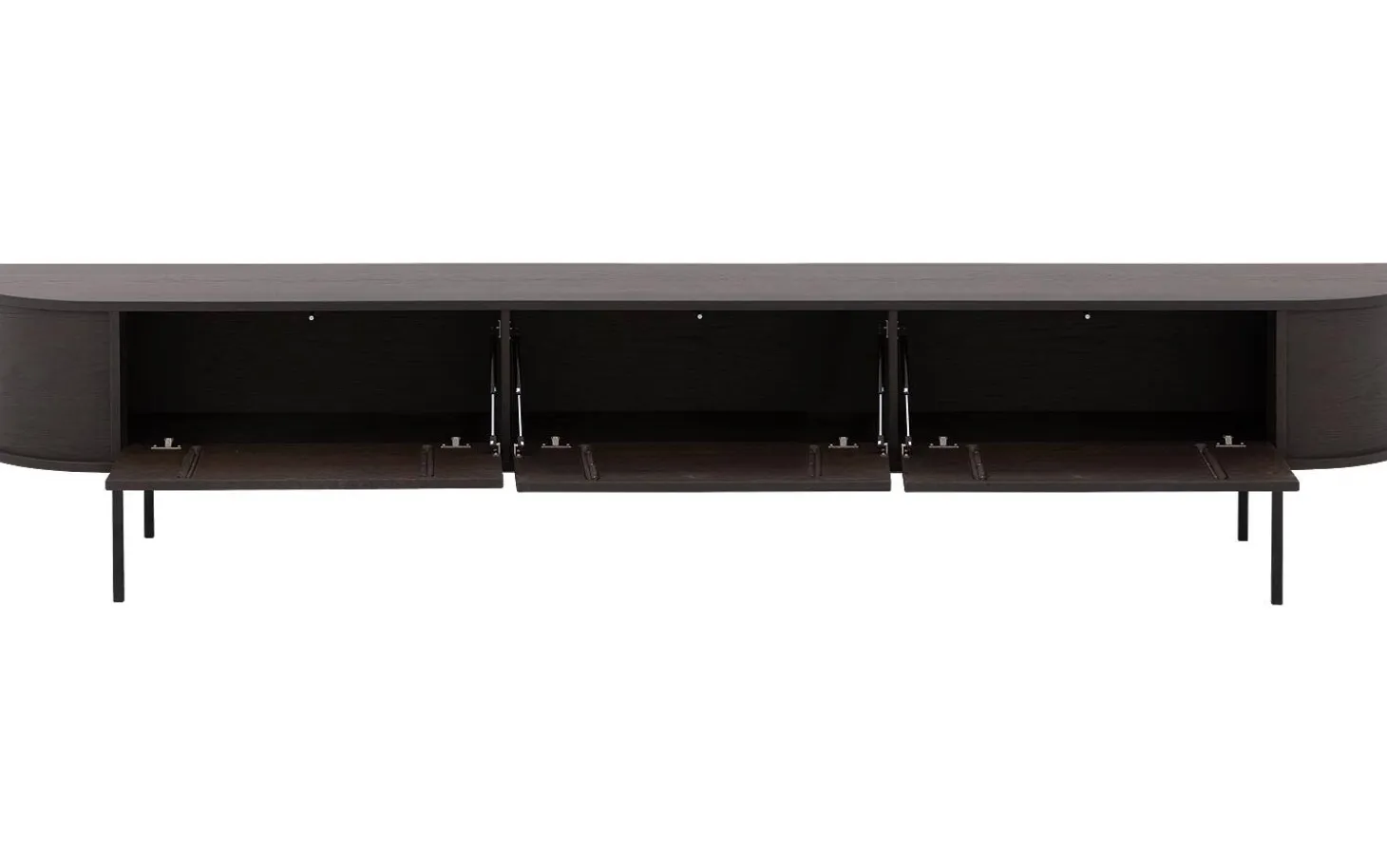Mit drei geräumigen Klappen haben Sie genügend Platz für all Ihre Geräte, von der Settopbox bis zu Spielkonsolen. Die subtilen schwarzen Metallfüße heben das Möbel elegant vom Boden ab und erleichtern die Reinigung. Nachhaltig produziert in den Niederlanden, also auch noch gut für die Umwelt.