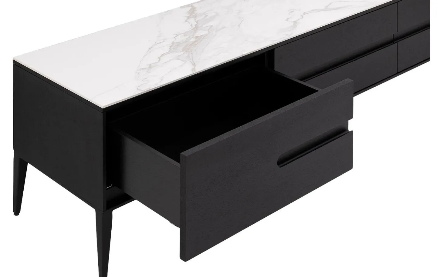 TV-Möbel Dexter kombiniert schwarzes Eschenholz mit luxuriösem Marmor für eine raffinierte Ausstrahlung. Dieses zeitlose TV-Möbel von 180 cm bietet mit drei geräumigen Schubladen reichlich Stauraum für all Ihre Sachen. Die hohen Beine verleihen Dexter eine luftige Ausstrahlung, während die Marmorplatte für eine elegante Finishing-Touch in Ihrem Wohnzimmer sorgt.