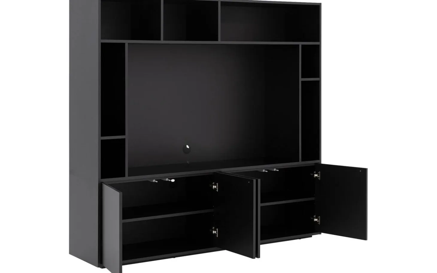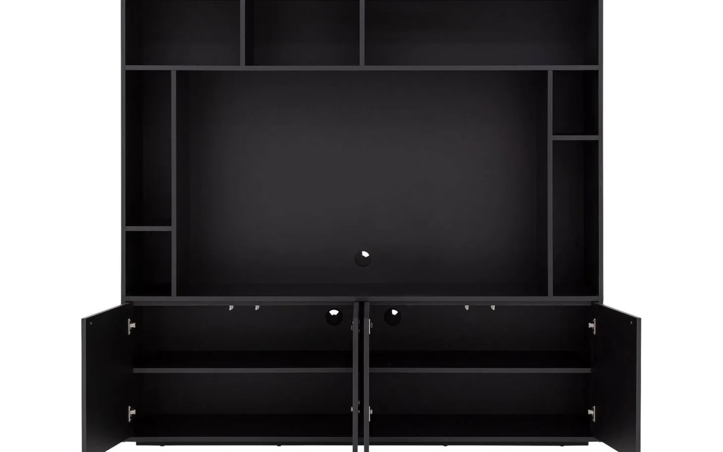 TV meubel Madrid maakt indruk met zijn royale formaat en strakke zwarte uitstraling. De zeven open vakken geven je alle ruimte voor je mediaspullen, decoratie en favoriete woonaccessoires. Achter de vier deuren berg je spullen netjes op die je liever uit het zicht houdt.