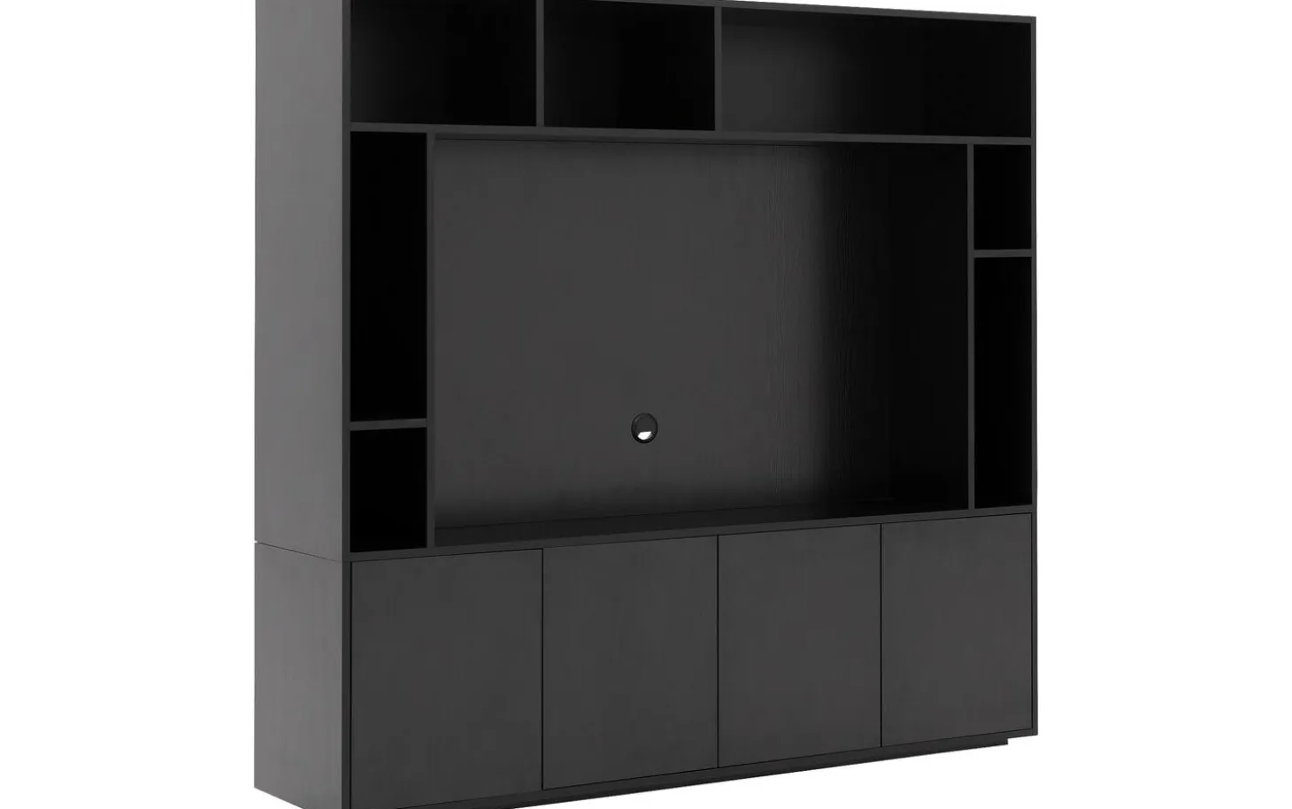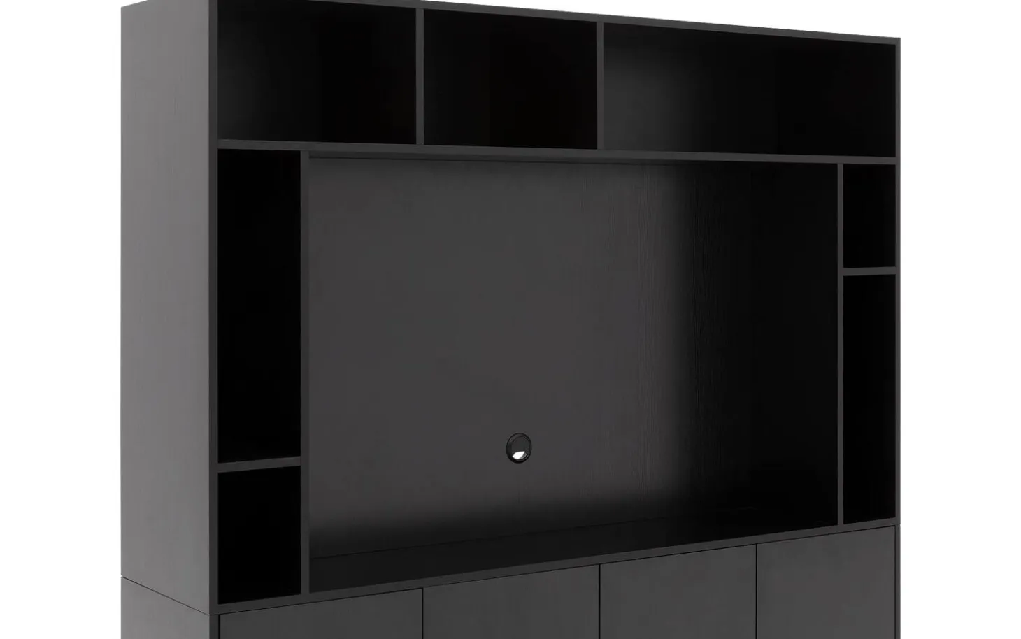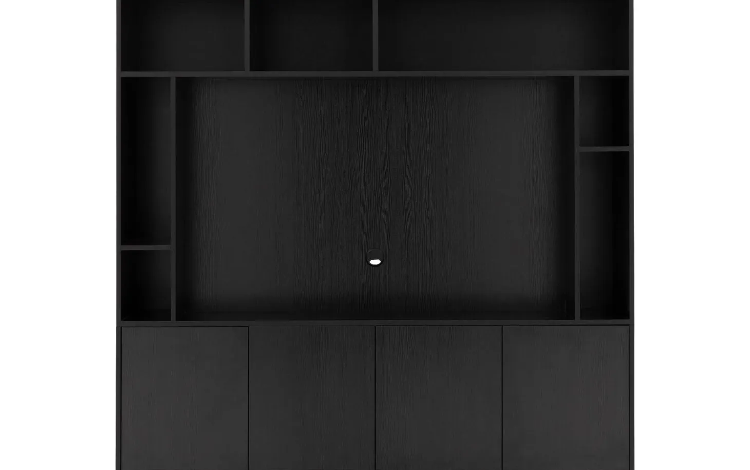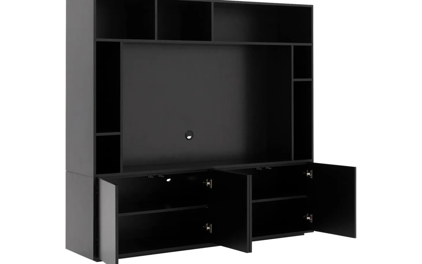 TV-Möbel Madrid kombiniert moderne Geradlinigkeit mit praktischem Stauraum in einem zeitlosen schwarzen Design. Dieses stehende Wandmöbel mit TV-Panel macht aus Ihrem Fernseher einen stilvollen Bestandteil der Einrichtung, während die offenen Fächer perfekt für die Präsentation Ihrer liebsten Wohnaccessoires geeignet sind.