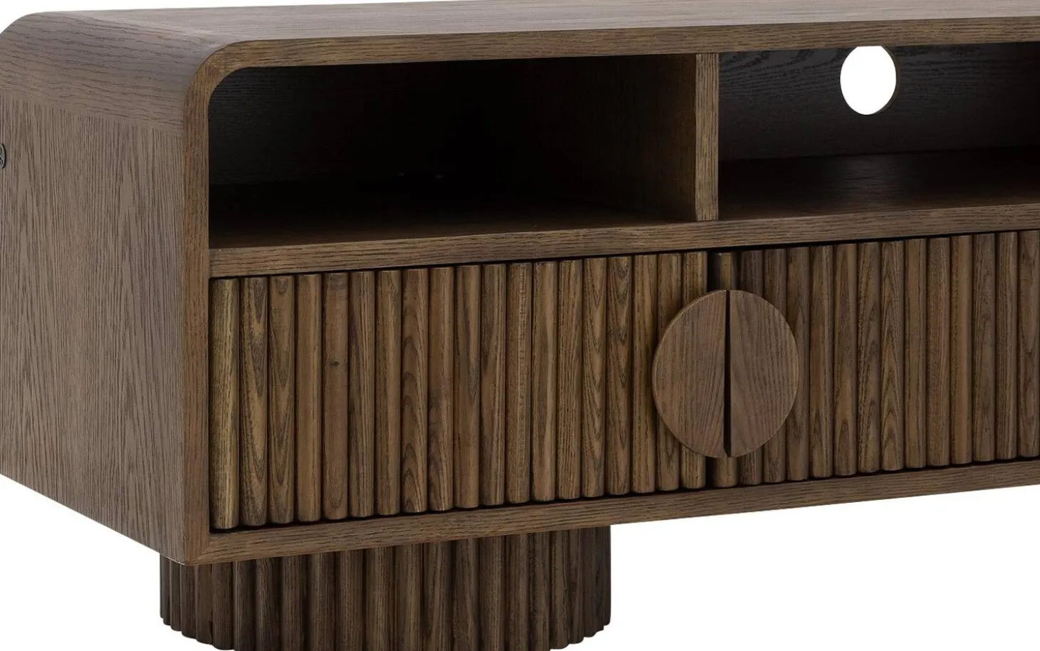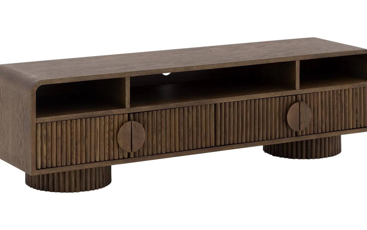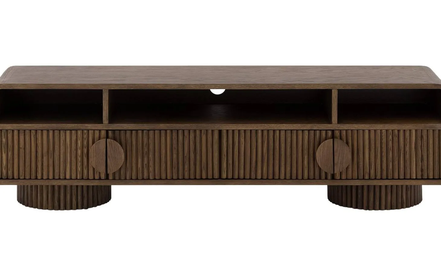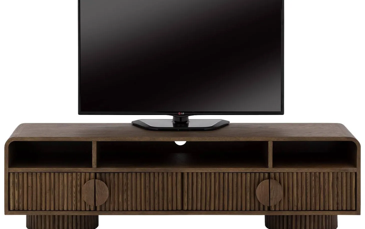Die runden Griffe fügen sich perfekt in das harmonische Design ein. Mit einer Breite von 160 cm bietet dieses TV-Möbel ausreichend Platz für Ihren Fernseher und zusätzlichen Stauraum hinter den Türen mit dekorativen Latten.