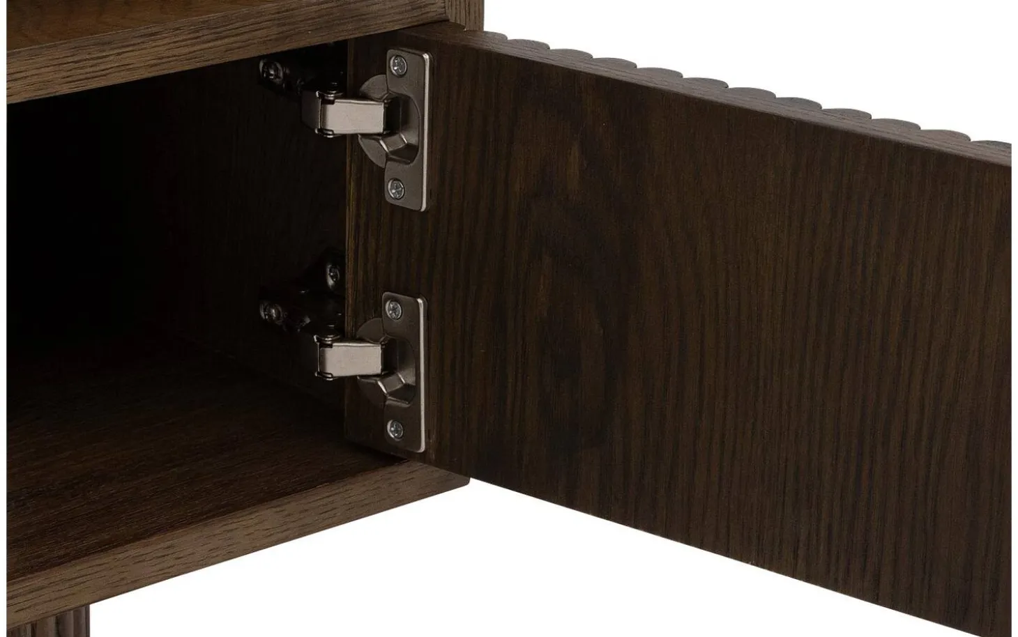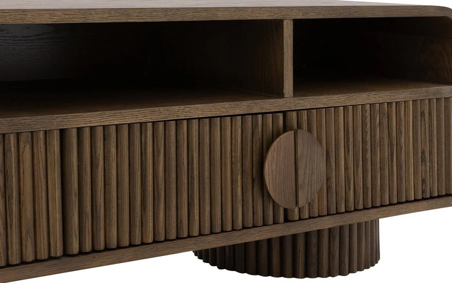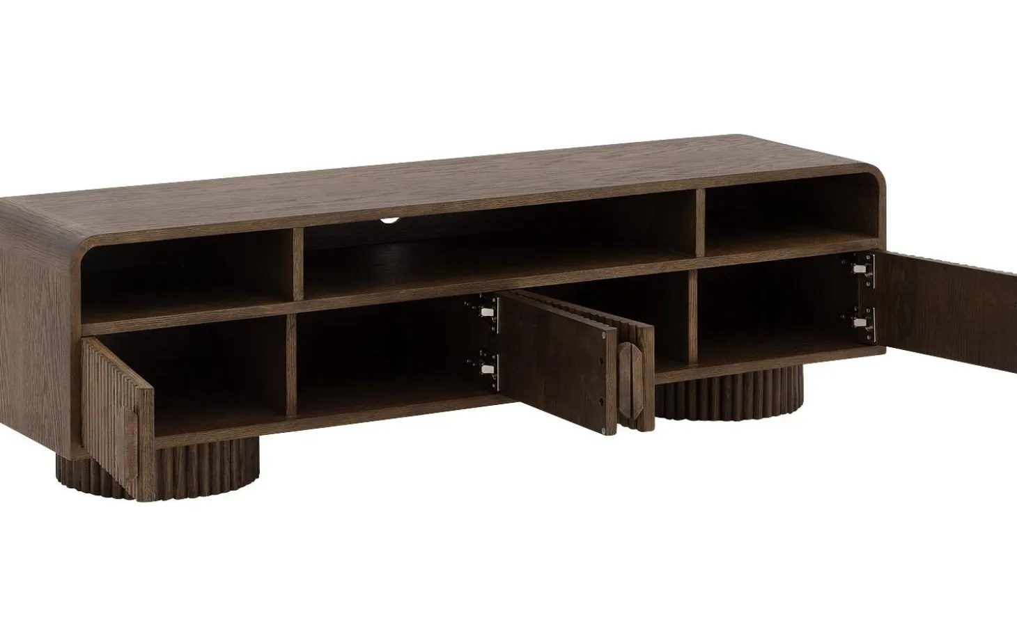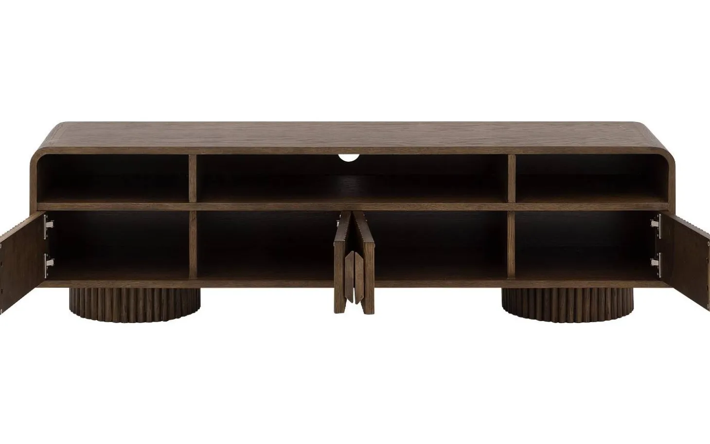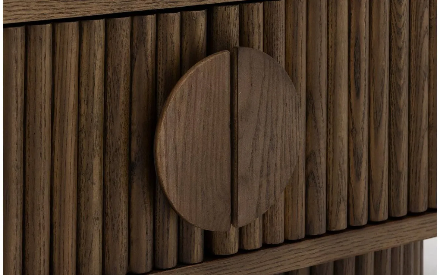 Die runden Griffe fügen sich perfekt in das harmonische Design ein. Mit einer Breite von 160 cm bietet dieses TV-Möbel ausreichend Platz für Ihren Fernseher und zusätzlichen Stauraum hinter den Türen mit dekorativen Latten.