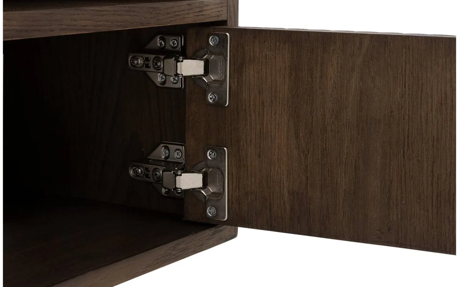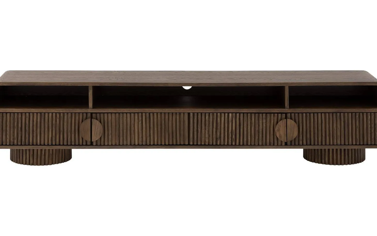 Der Eichen-Soft-Touch-Lack erhält die natürliche matte Ausstrahlung des Holzes, während die Schutzschicht für weniger Ringe und Kratzer sorgt. Die praktische Aufteilung mit vier geschlossenen Fächern und drei offenen Fächern gibt Ihnen alle Möglichkeiten, Geräte ordentlich zu verstauen oder schön zu präsentieren.
