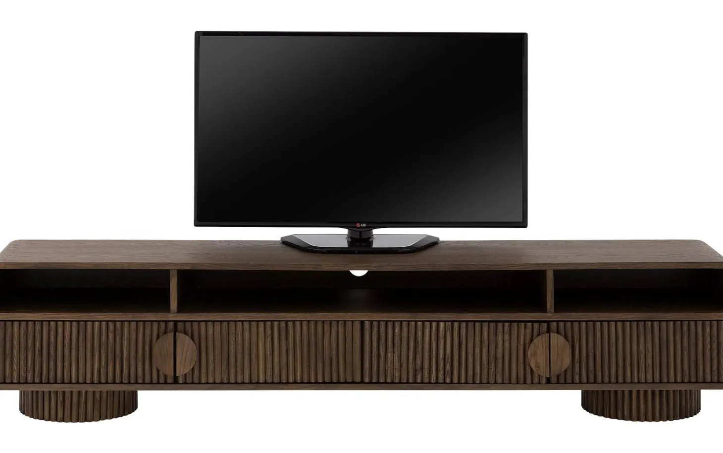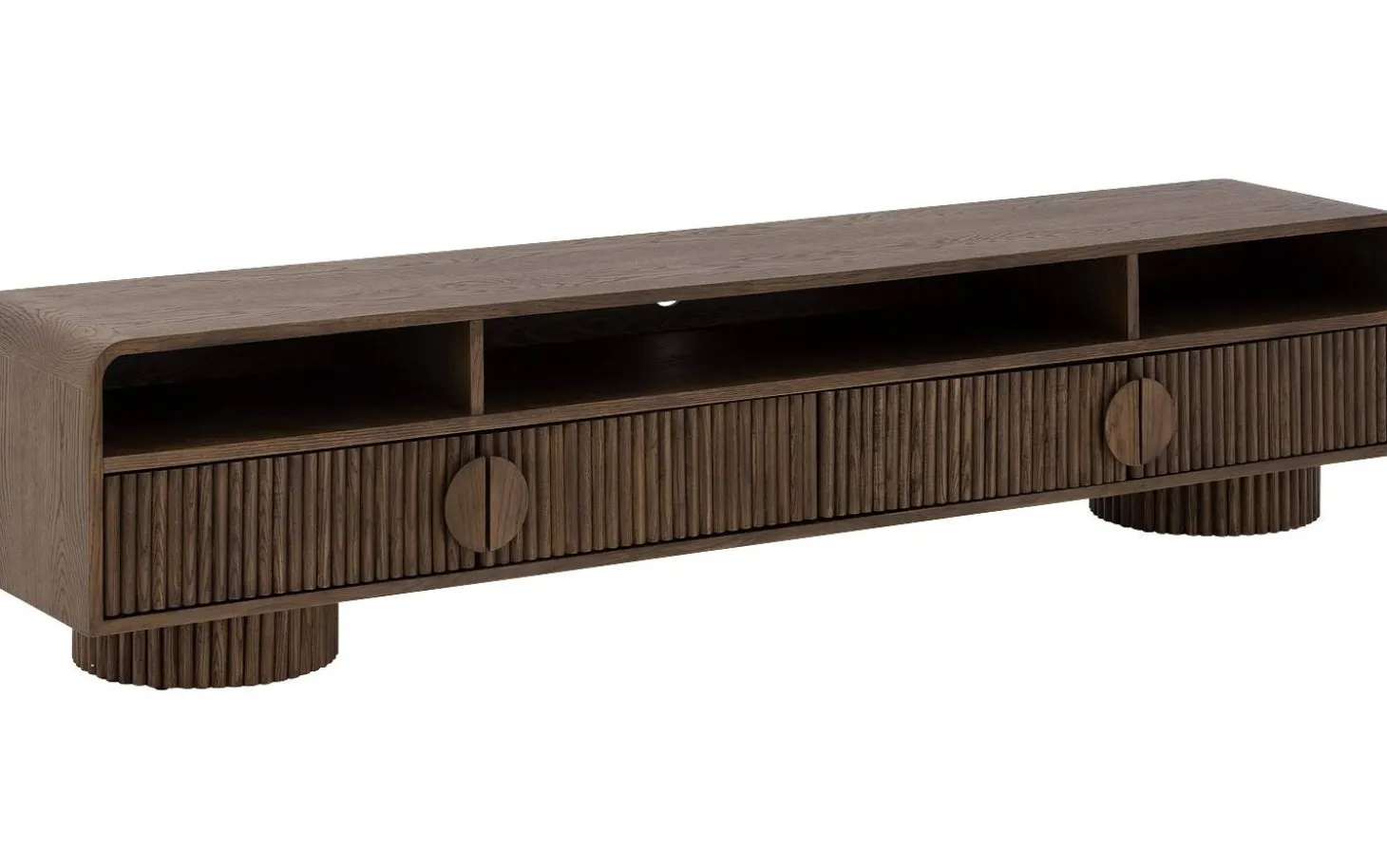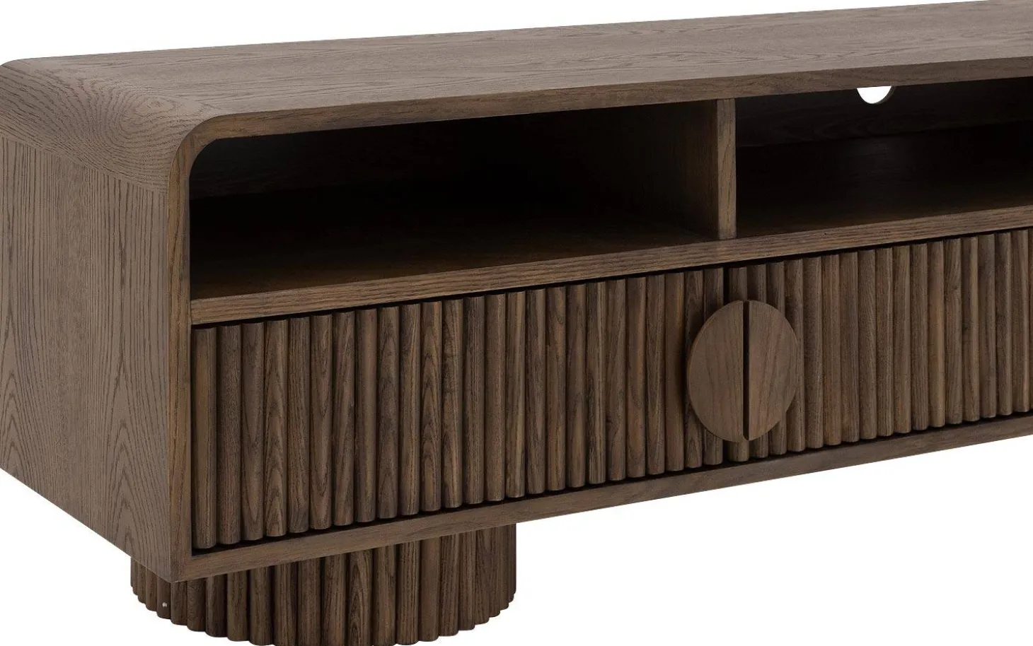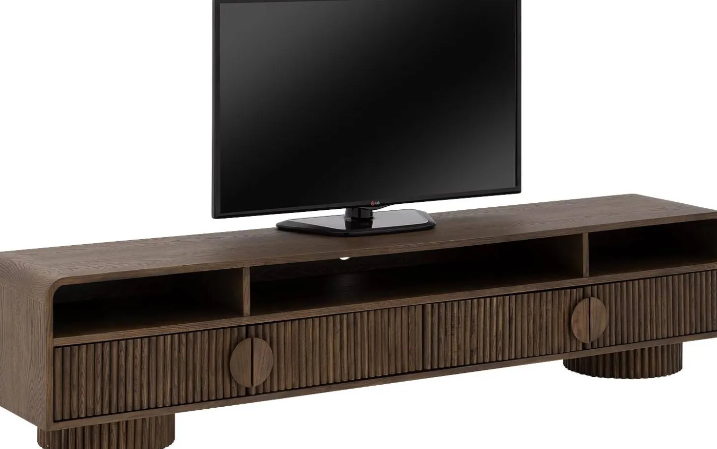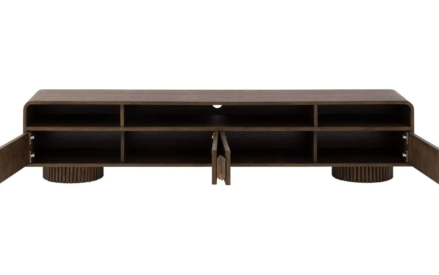 Dieses braune Eichen-TV-Möbel kombiniert stilvolle Wärme mit praktischem Stauraum für all Ihre Geräte. Die abgerundeten Formen und die natürliche Holzmaserung verleihen dem TV-Möbel Melani eine einladende Ausstrahlung, die perfekt zu einem gemütlichen Wohnzimmer passt. Mit vier Türen und drei offenen Fächern haben Sie ausreichend Platz für Ihr Entertainment-Setup.