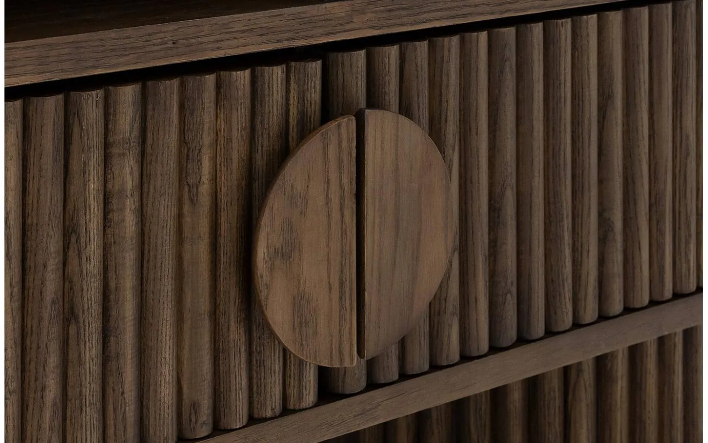 Das TV-Möbel Melani strahlt Wärme und Gemütlichkeit aus mit seiner braunen Eichen-Veredelung und sanften, abgerundeten Linien. Die großen runden Füße und passenden Griffe verleihen diesem Möbel einen harmonischen Charakter. Durch die natürliche Holzmaserung bleibt die warme Holzoptik schön sichtbar und fühlbar.