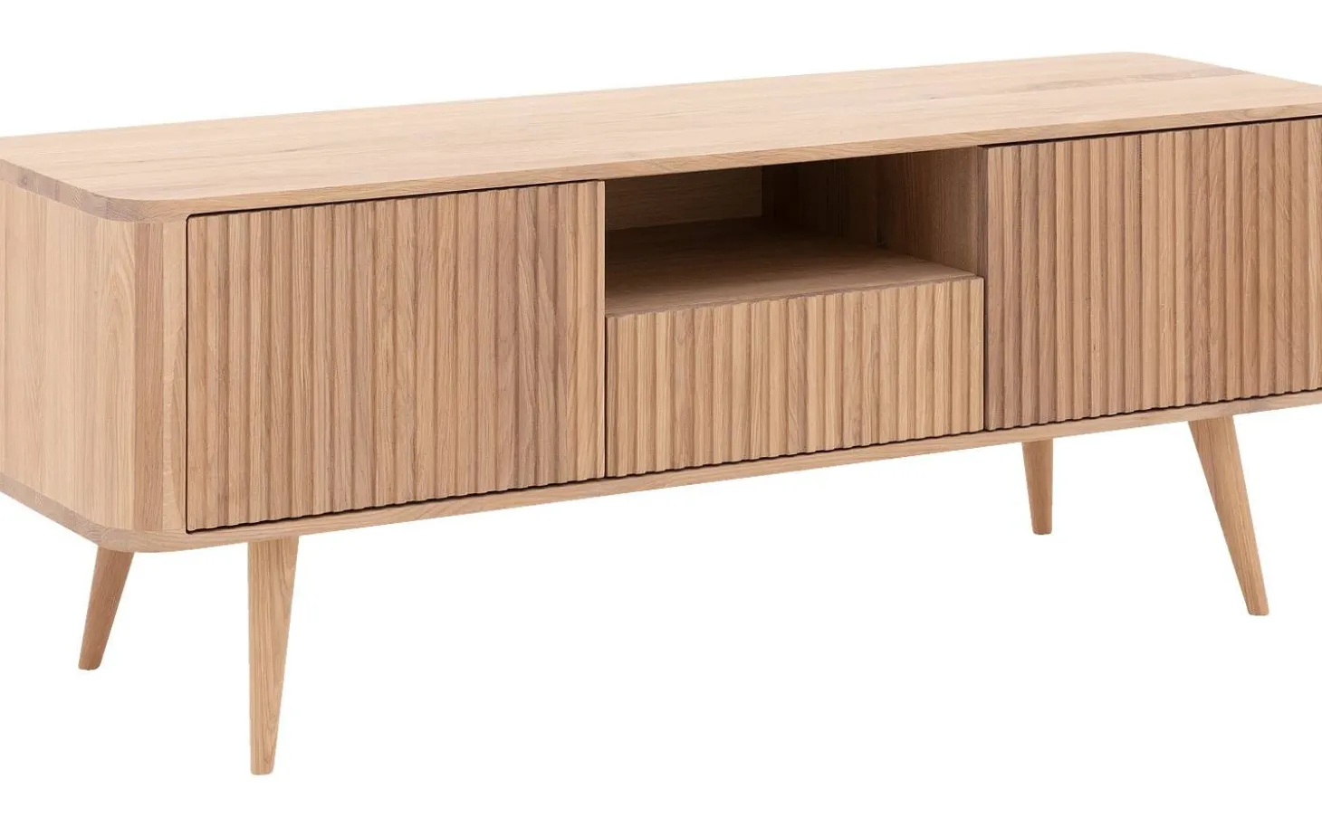 TV-Möbel Seppe strahlt pure skandinavische Wärme aus durch das nachhaltige Eichenholz mit weißer Öl-Oberfläche. Die runde Formgebung verleiht einen Retro-Touch, der perfekt zu sowohl modernen als auch klassischen Einrichtungen passt. Dieses eichene TV-Möbel behält seinen natürlichen Holzcharakter durch die Ölschicht, die es vor Flecken schützt.