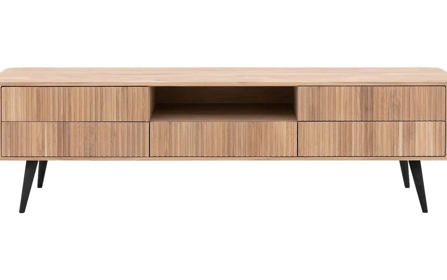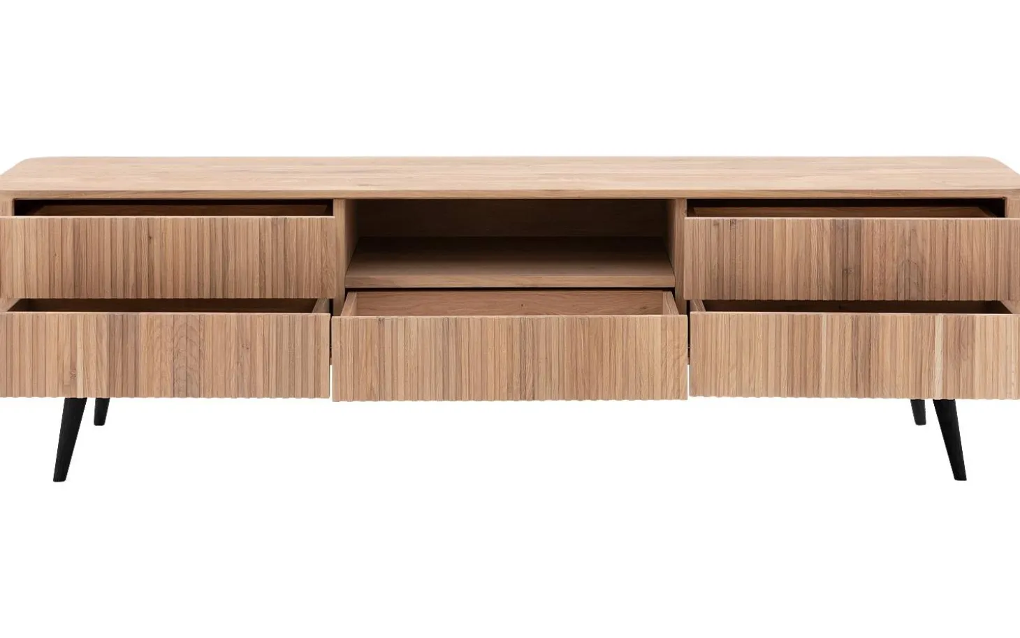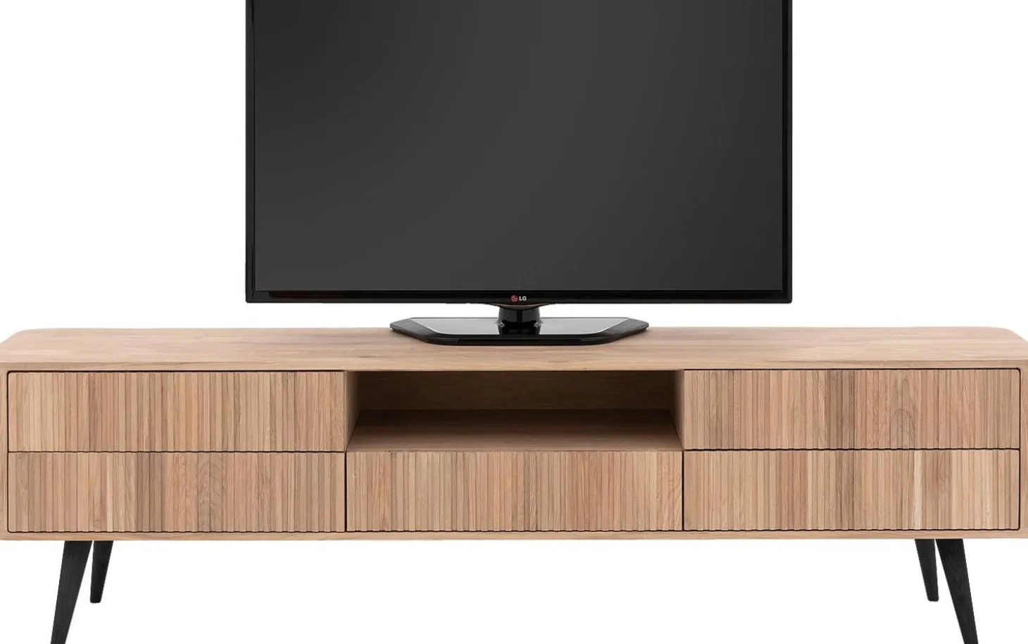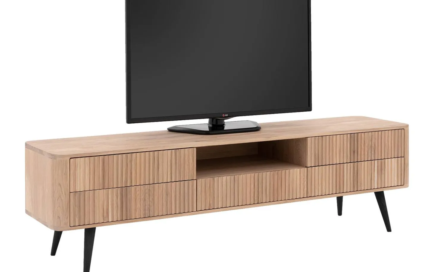 Fünf geräumige Schubladen (50 x 8 x 31 cm) bieten reichlich Platz für Ihre Medien-Accessoires, während das offene Fach (54 x 12 x 39 cm) perfekt für Ihren Receiver oder Ihre Spielekonsole ist. Die stabilen Holzbeine (20 cm hoch) verleihen dem Ganzen eine schwebende Ausstrahlung.