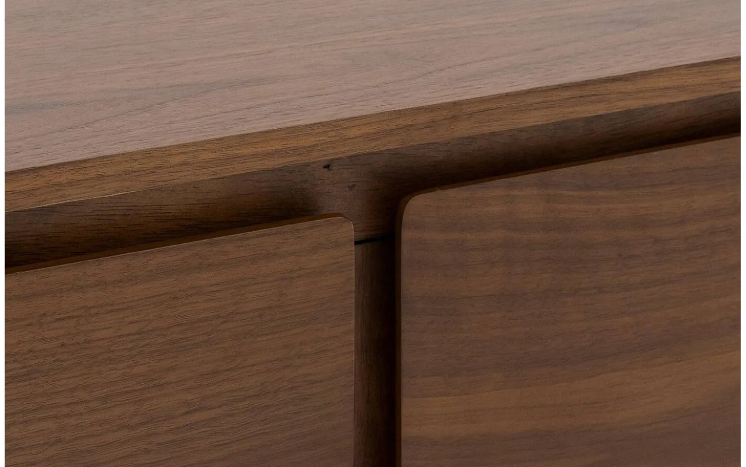 Das Eschenholz erhält durch die lackierte Ausführung eine reiche braune Farbe, die schön auffällt, ohne zu dominant zu werden. Die Push-to-Open-Türchen und die Schublade schließen ohne Griffe an die klare Formgebung an. Das Soft-Close-System schützt Ihr Möbel vor harten Stößen.