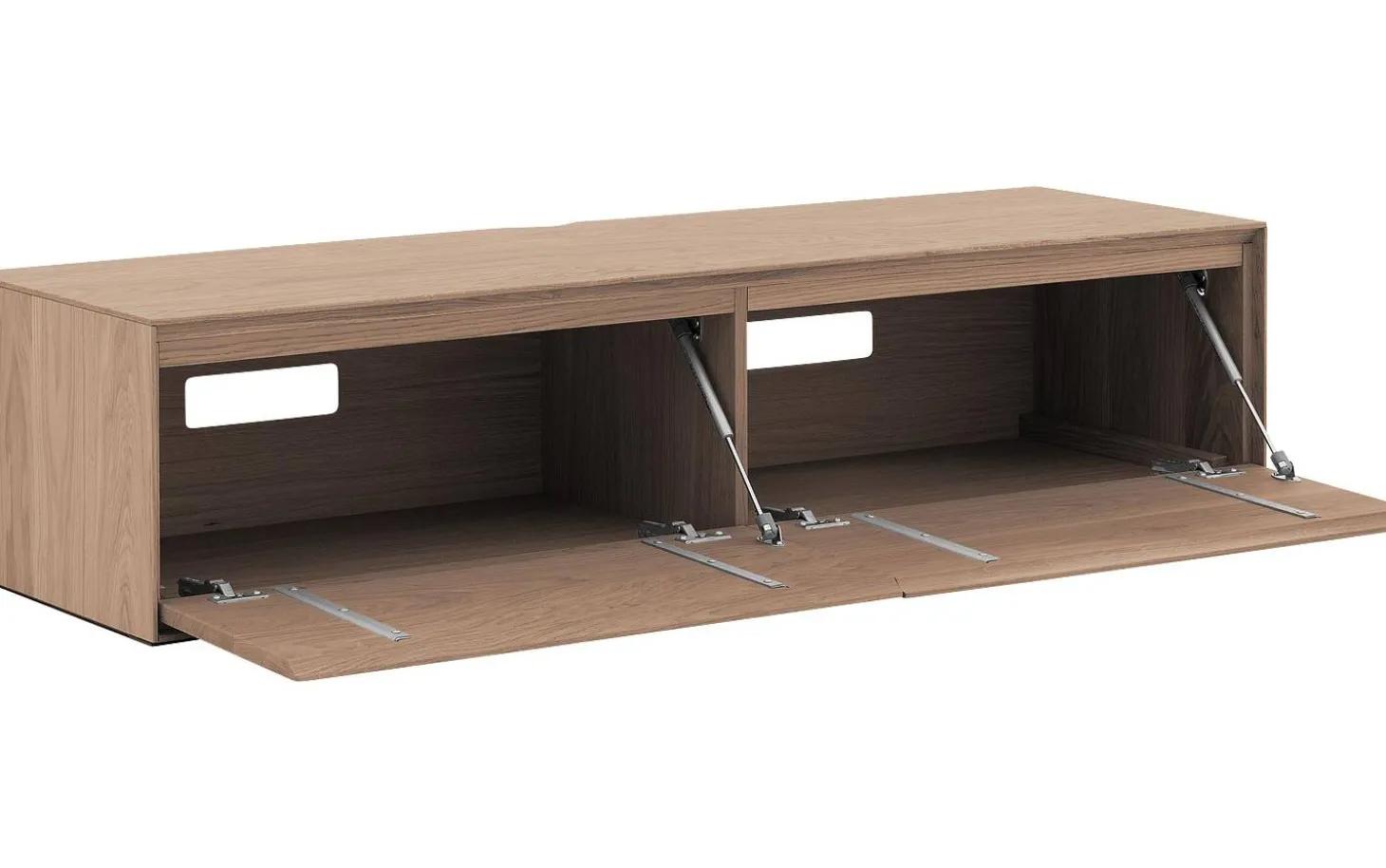 Die zwei Klappen des TV-Möbels Vic sind mit hydraulischen Dämpfern und Soft-Closing-System ausgestattet. Dadurch öffnen sie langsam und schließen sanft, ohne harte Schläge, die Ihr Möbel beschädigen könnten. Hinter den Klappen finden Sie ein geräumiges Fach von 73 x 28 x 39 cm für all Ihre Geräte.