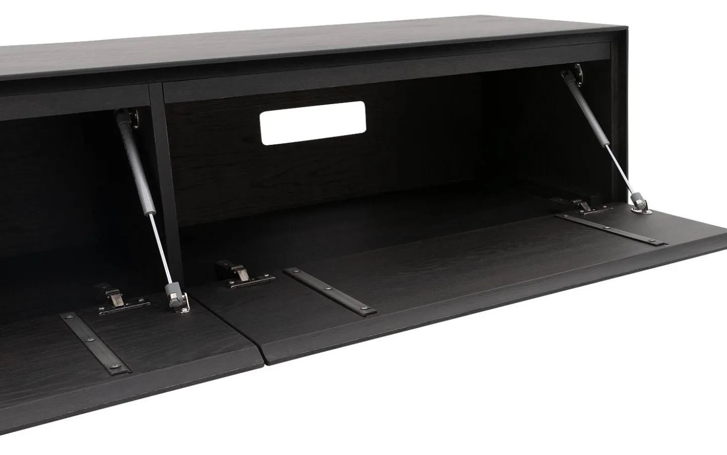 Der Eichen-Soft-Touch-Lack in Deep Grey verleiht diesem TV-Möbel seine charakteristische Ausstrahlung. Hinter den beiden Klappen finden Sie ein geräumiges Fach (73 x 28 x 39 cm), in das all Ihre TV-Geräte perfekt hineinpassen. Das hydraulische System sorgt dafür, dass sich die Klappen langsam öffnen, während das Soft-Closing-System sie sanft schließen lässt.