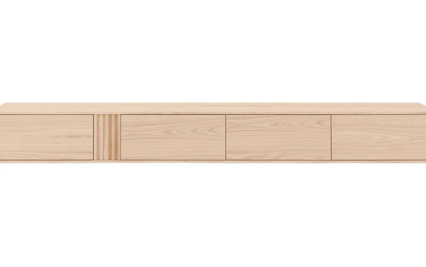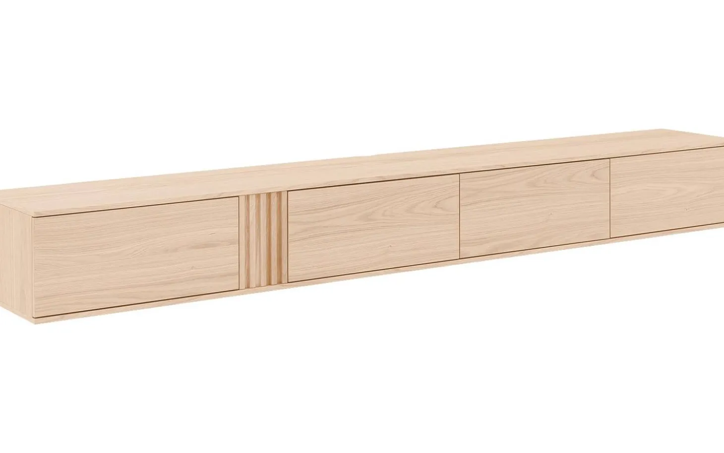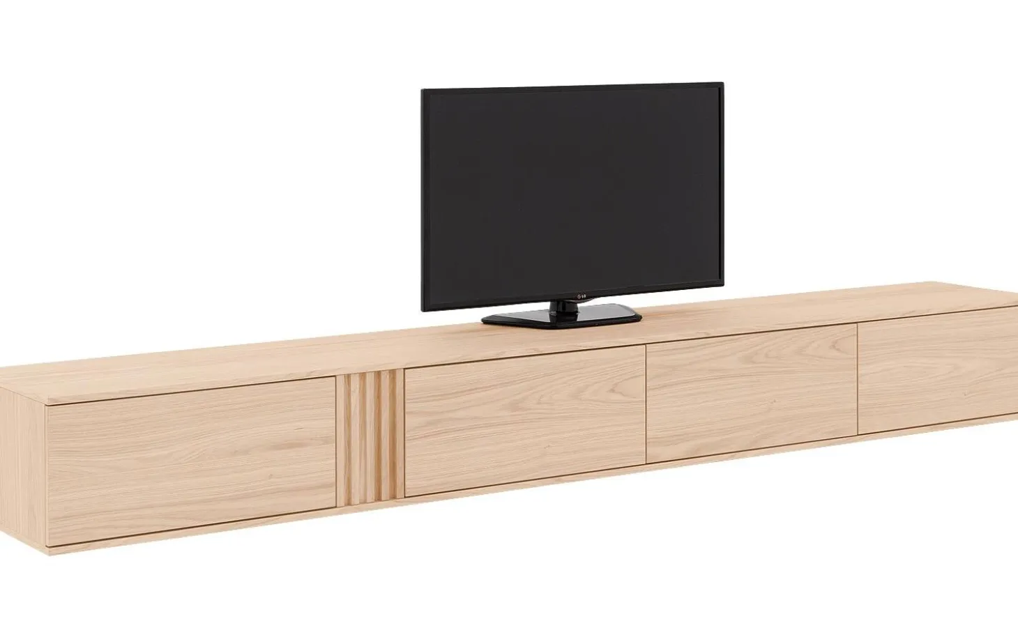 TV-Möbel Viola kombiniert klare moderne Linien mit warmen Eichendetails. Dieses hängende TV-Möbel von 300 cm bietet großzügigen Stauraum hinter vier eleganten Klappen mit Push-to-Open-System. Die weiße Ausstrahlung mit Eichenakzenten passt perfekt in jedes zeitgenössische Interieur und sorgt für ein aufgeräumtes, stilvolles Wohnzimmer.