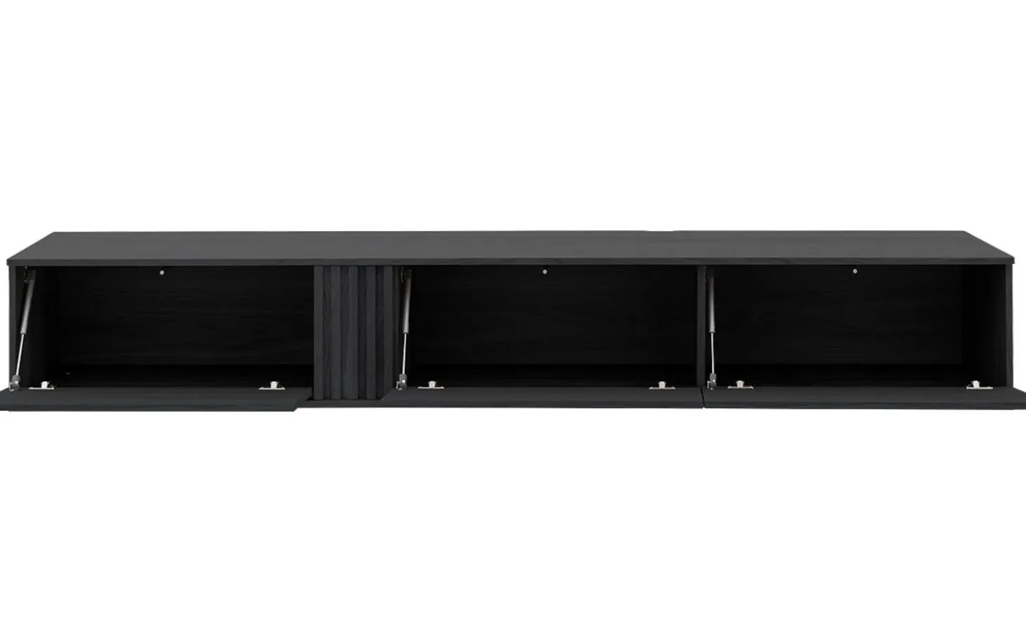 Mit drei praktischen Klappen haben Sie ausreichend Platz für Ihr TV-Zubehör, Spielkonsolen und andere Elektronik. Die schwebende Montage sorgt nicht nur für eine moderne Ausstrahlung, sondern macht auch das Reinigen deutlich einfacher.