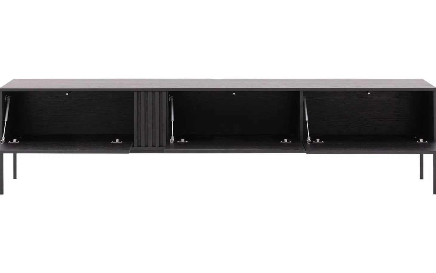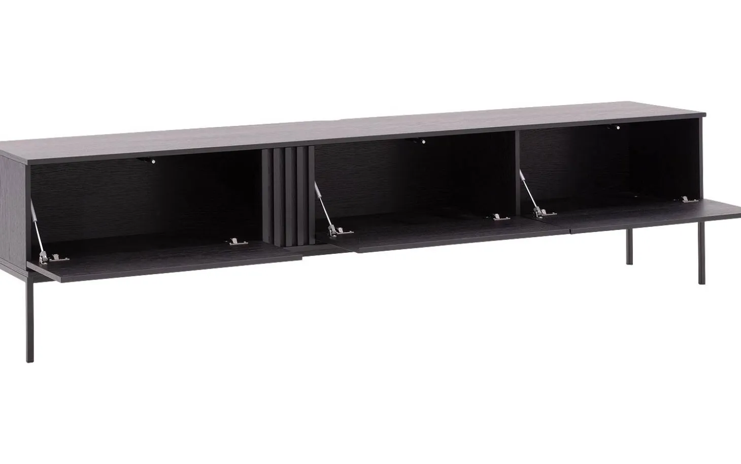 TV-Möbel Viola bringt eine kraftvolle, moderne Ausstrahlung in Ihr Wohnzimmer. Dieses schwarze Eichen-TV-Möbel kombiniert klare Linien mit warmen Holznuancen, perfekt für ein zeitgemäßes Interieur. Das clevere Push-to-Open-System sorgt für einen minimalistischen Look ohne Griffe, während Sie alle Geräte ordentlich verstauen.