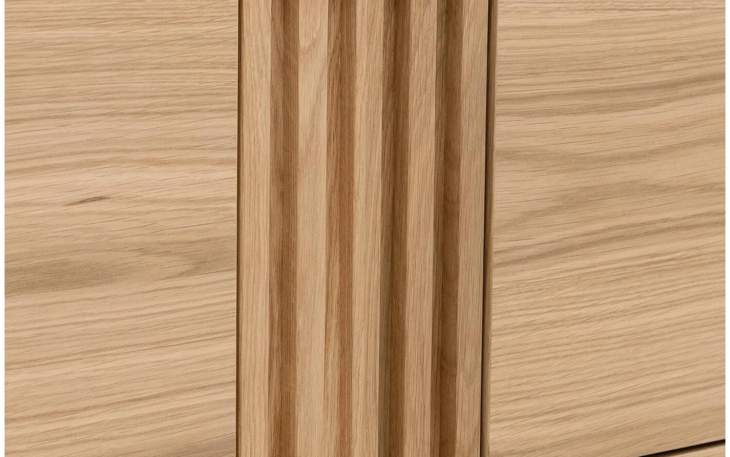 Die drei Klappen des TV-Möbels Viola öffnen sich mühelos dank des praktischen Push-to-Open-Systems. Einfach kurz drücken und die Tür öffnet sich von selbst – ideal für das klare Design ohne Griffe. Das helle Eichenfurnier ist mit Soft-Touch-Lack für zusätzlichen Schutz behandelt.