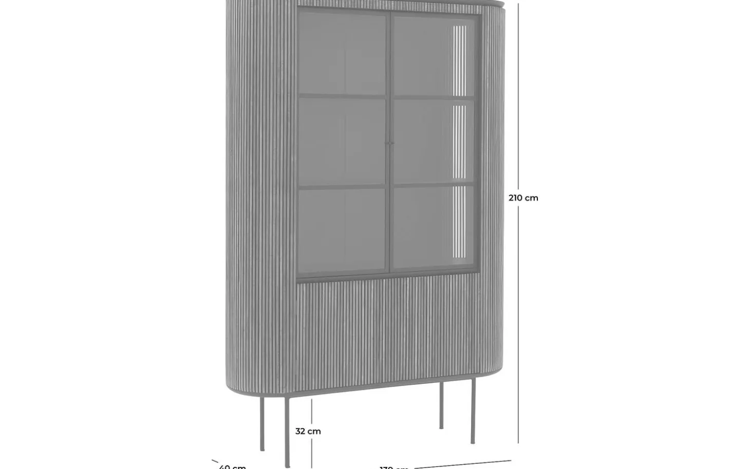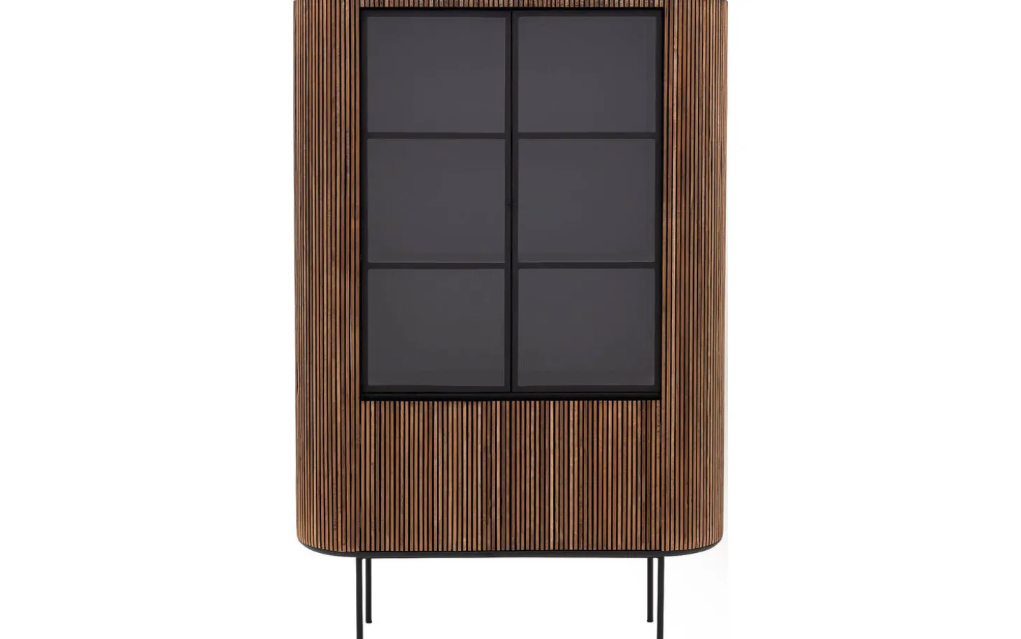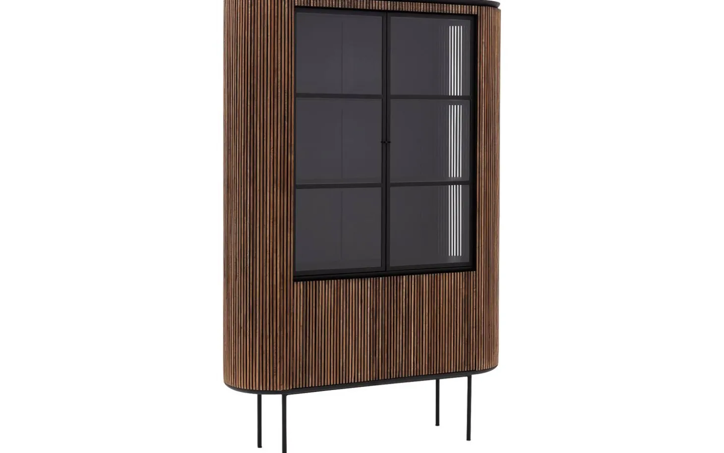 Vitrinenschrank Adel strahlt Wärme und Charakter aus durch die Verwendung von Teak mit weißer Wachsveredelung. Die vertikale Struktur und runden Formen verleihen diesem freistehenden Schrank eine zeitlose Eleganz. Ihr schönstes Geschirr, Bücher oder Wohnaccessoires kommen hinter den Glastüren wunderschön zur Geltung.