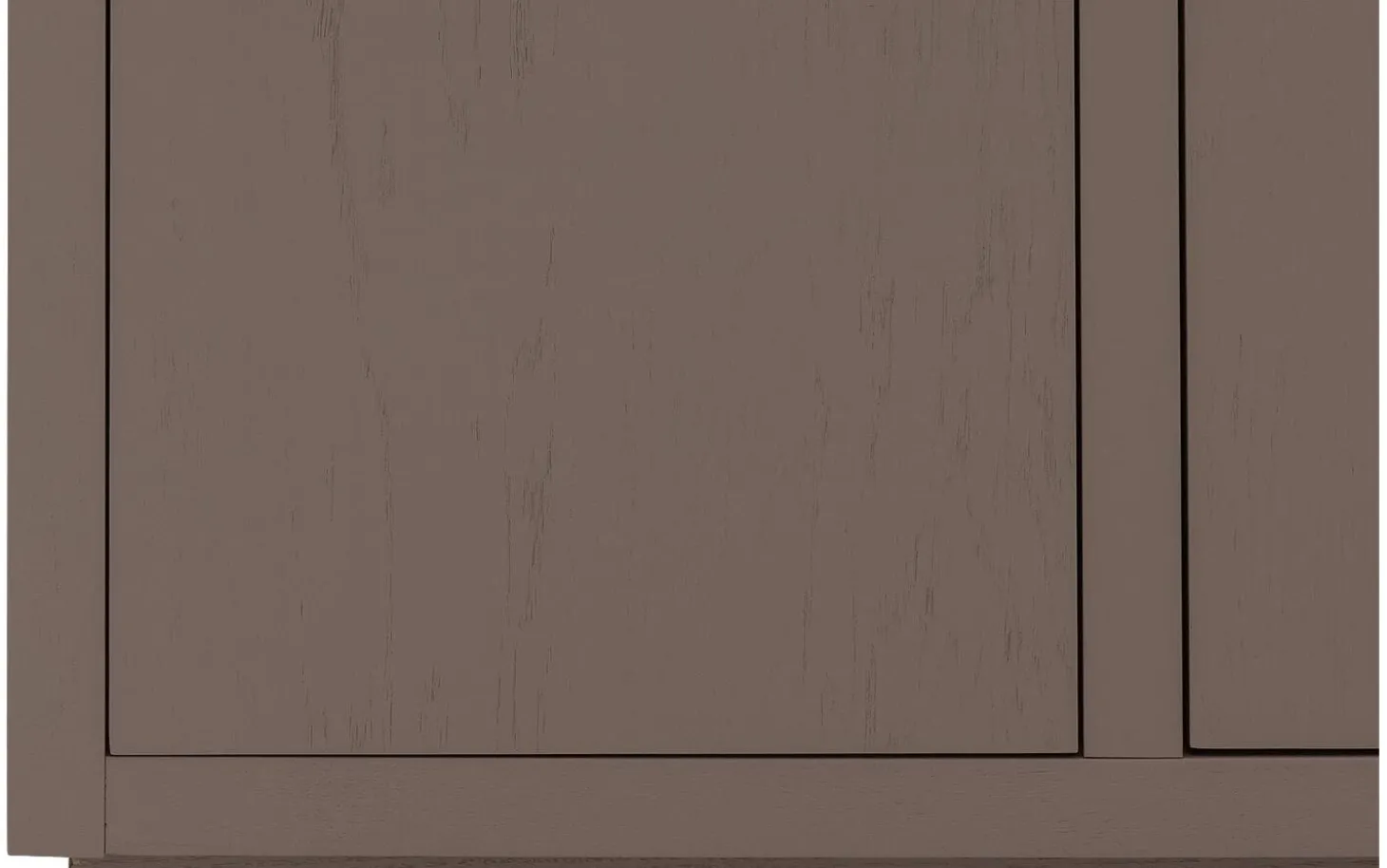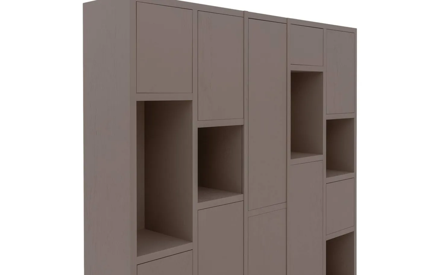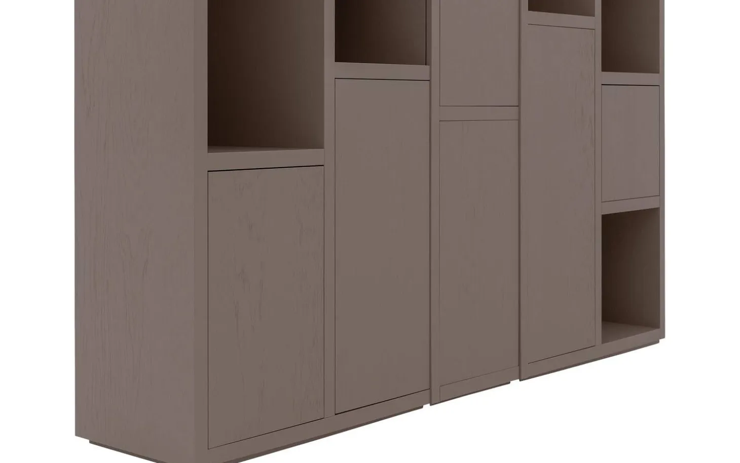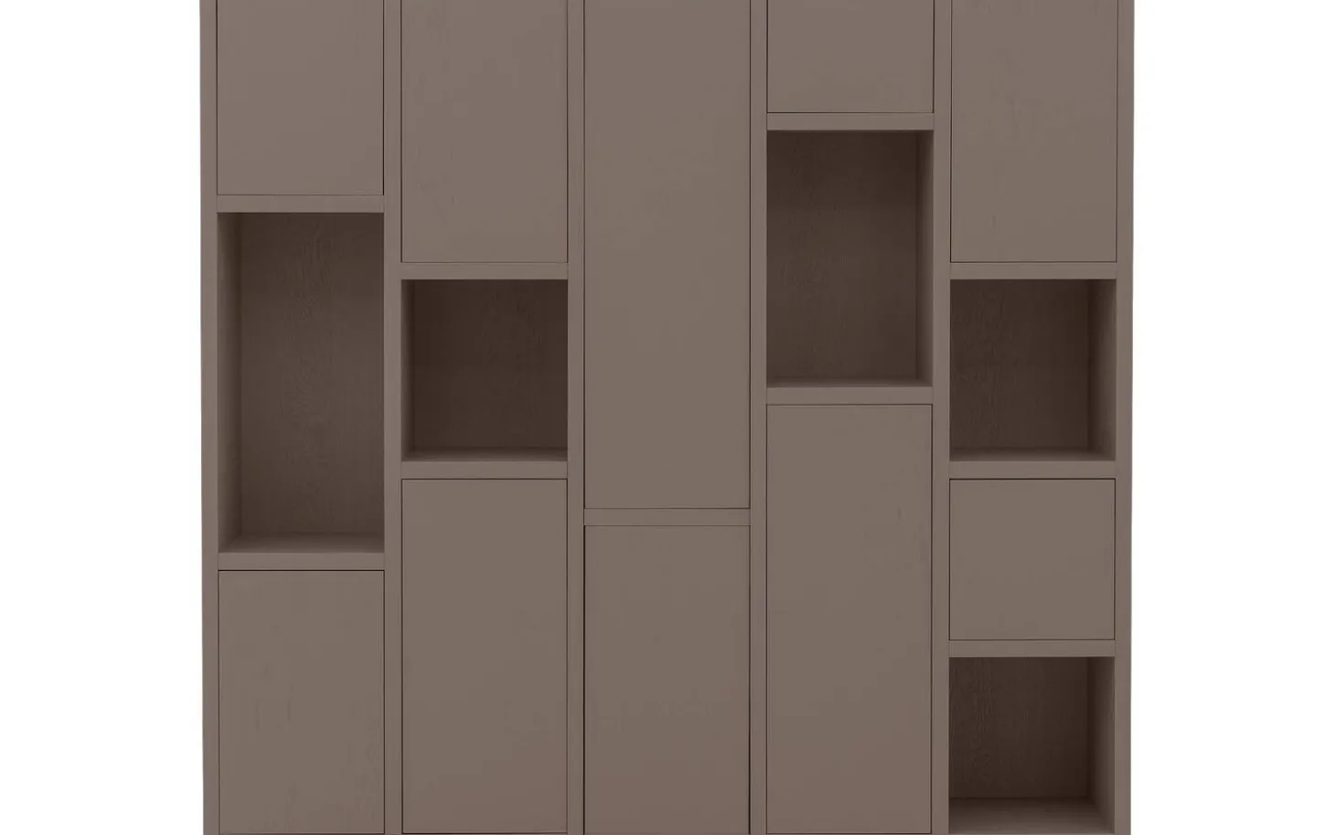 Dit bruine eiken wandmeubel maakt indruk door zijn royale formaat en verfijnde taupe laklaag. De warme houtkleur zorgt voor een natuurlijk karakter, terwijl de strakke lijnen een moderne touch geven. Open vakken en gesloten opbergvakken wisselen elkaar mooi af voor een speels effect.