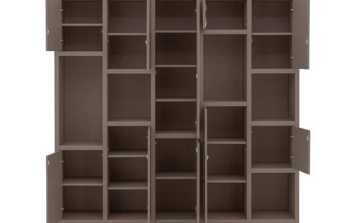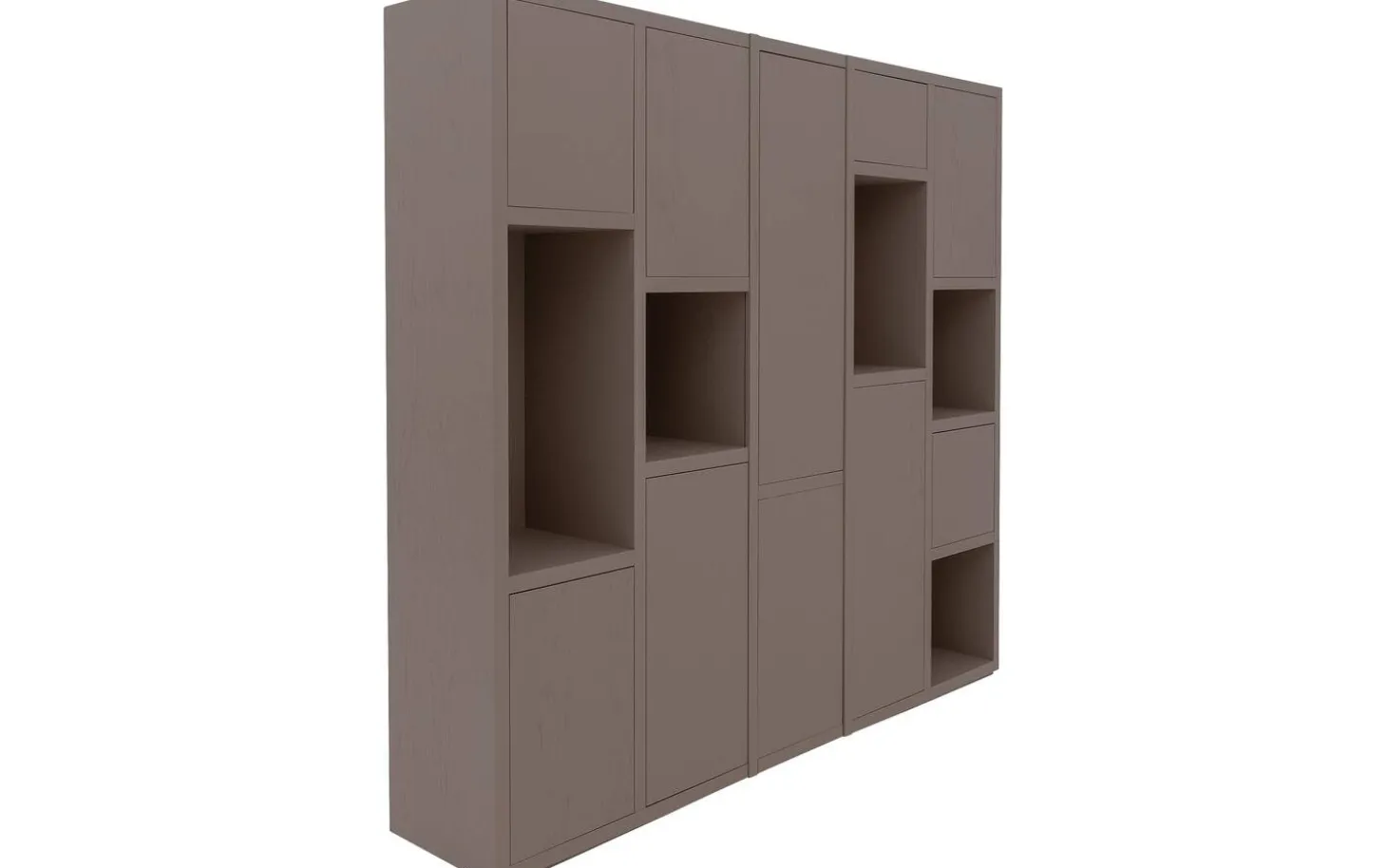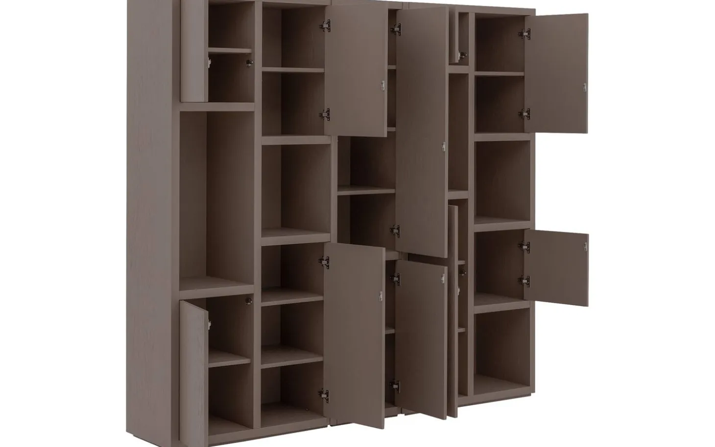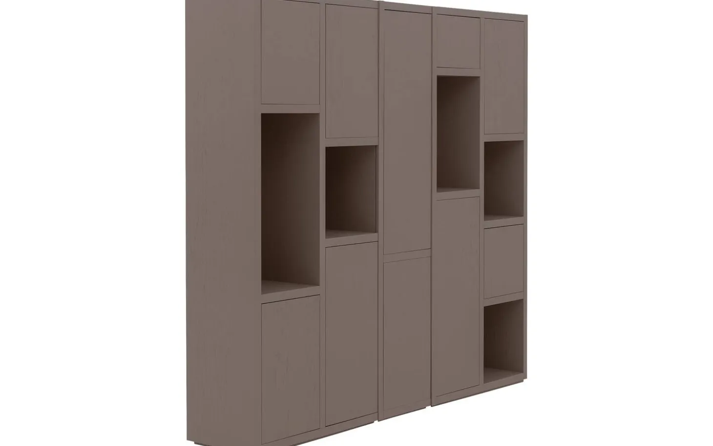 Dit bruine eiken wandmeubel maakt indruk door zijn royale formaat en verfijnde taupe laklaag. De warme houtkleur zorgt voor een natuurlijk karakter, terwijl de strakke lijnen een moderne touch geven. Open vakken en gesloten opbergvakken wisselen elkaar mooi af voor een speels effect.