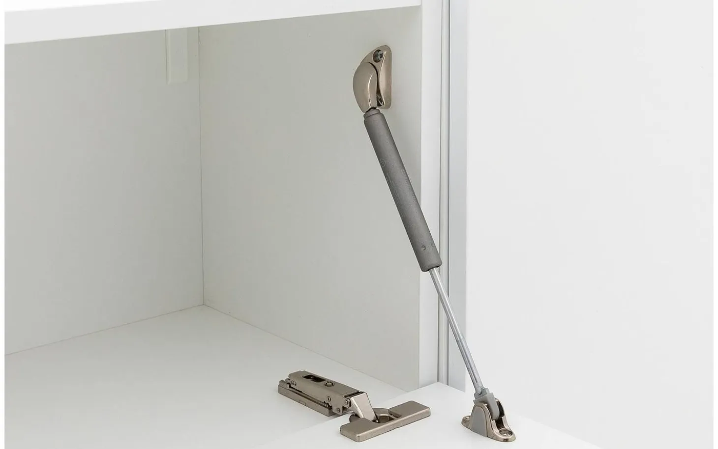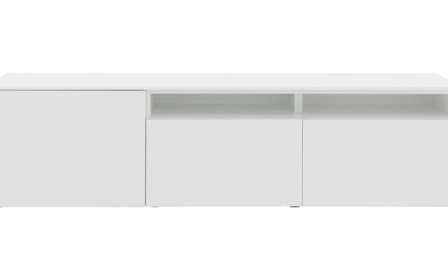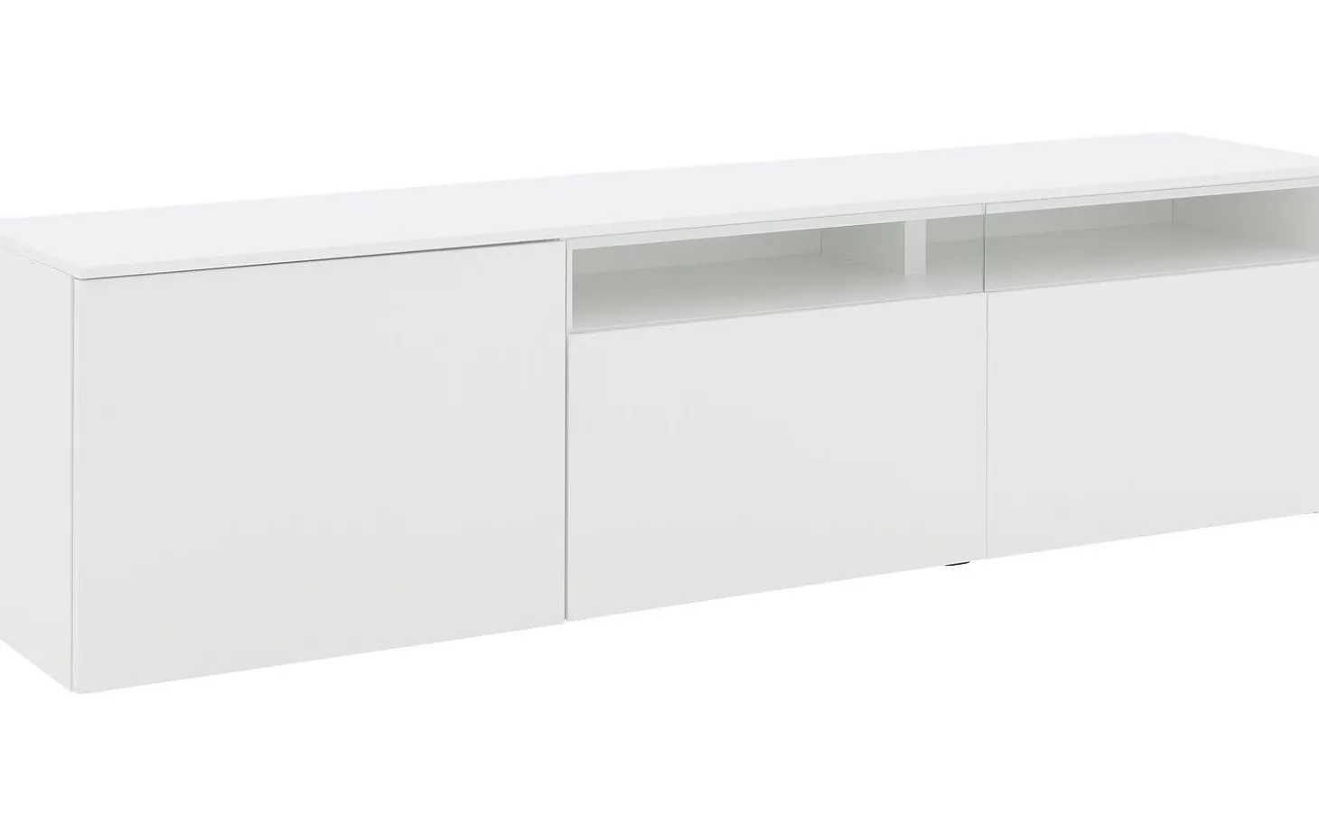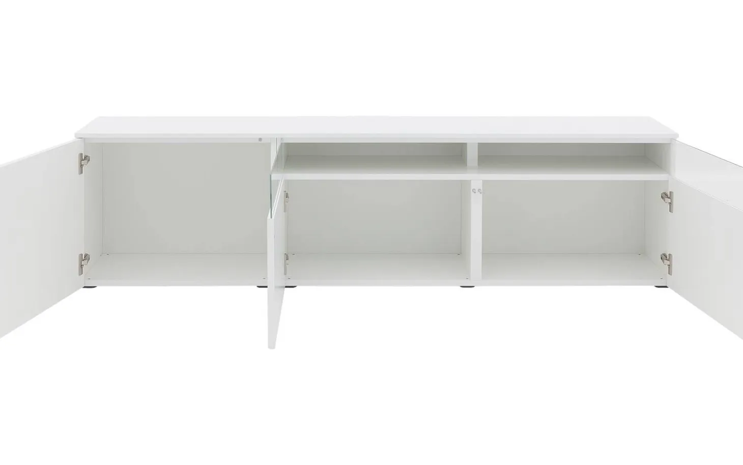 Der weiße Seidenglanslack des Wandmöbels Monza sorgt für eine klare, moderne Ausstrahlung, bei der die Holzstruktur vollständig verschwunden ist. Diese mehrschichtige Verarbeitung bietet ausgezeichneten Schutz vor täglichen Einflüssen. Die vier Türen und die Klappe funktionieren mit einem praktischen Push-to-Open-System für einen cleanen Look.