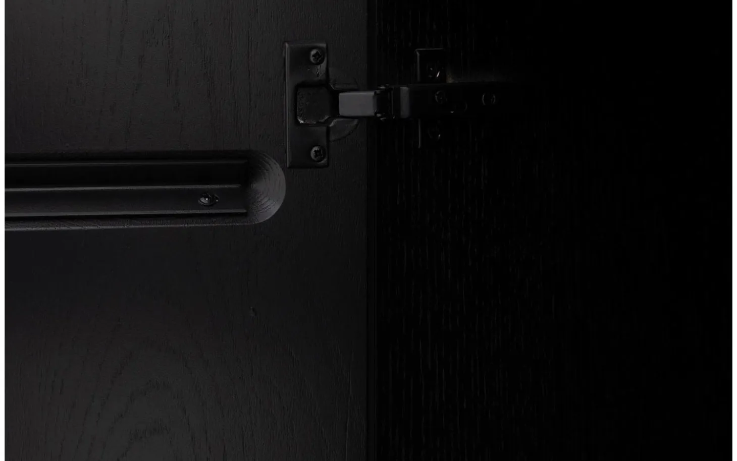 Dieses schwarze Eichen-Wandmöbel beeindruckt mit seinem robusten Look und seiner natürlichen Ausstrahlung. Der Soft-Touch-Lack erhält die matte Textur des Eichenholzes, wodurch die Maserung sichtbar und fühlbar bleibt. Eine kraftvolle Kombination, die Charakter in Ihr Wohnzimmer oder Esszimmer bringt.