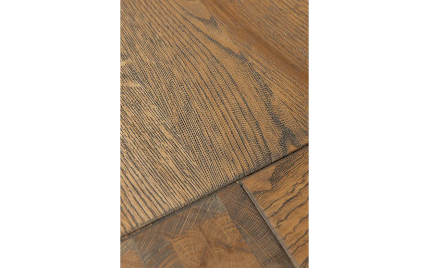 Die Tischplatte ist aus dunkelgrauer Eiche mit einer Ölbehandlung gefertigt, die die natürliche Maserung betont. Die grobe Struktur sorgt für eine authentische Ausstrahlung, die den Charakter von natürlichem Holz vollständig zur Geltung bringt.